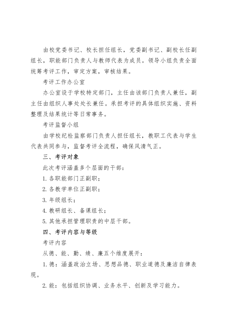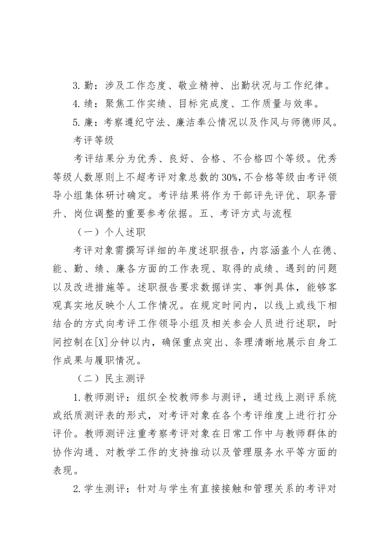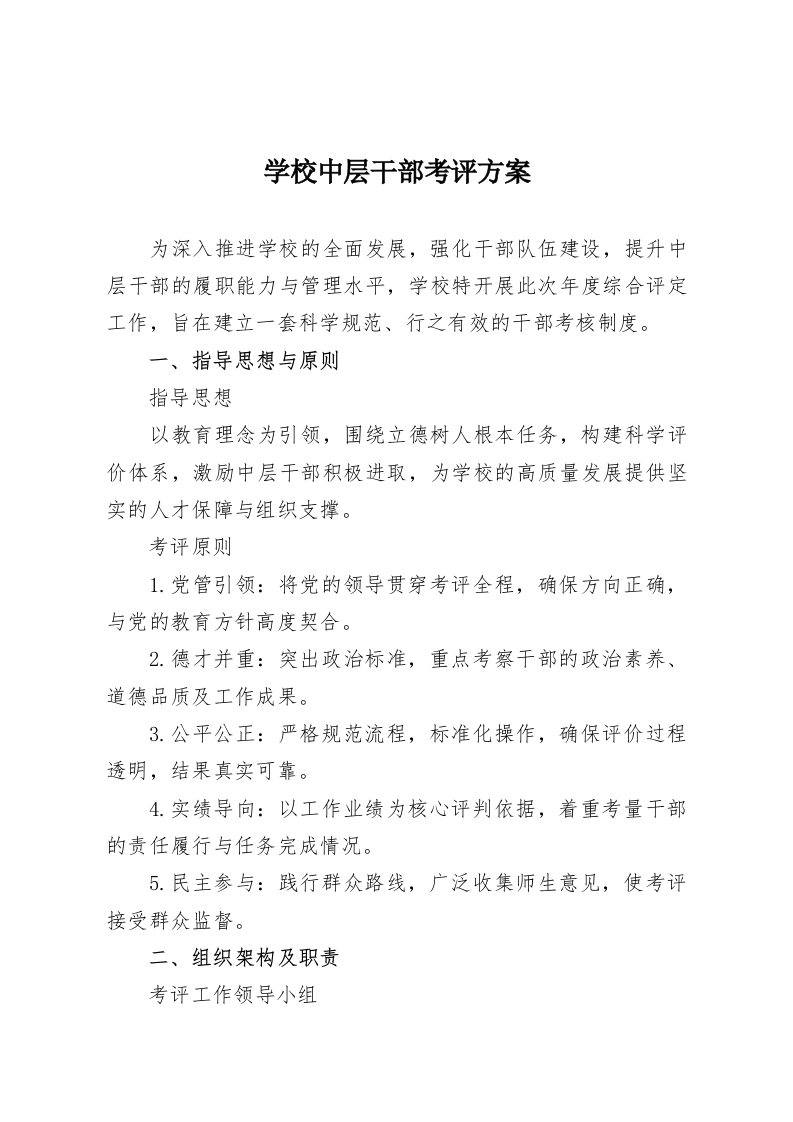 学校中层干部考评方案为深入推进学校的全面发展,强化干部队伍建设,提升中层干部的履职能力与管理水平,学校特开展此次年度综合评定工作,旨在建立一套科学规范、行之有效的干部考核制度。一、指导思想与原则指导思想以教育理念为引领,围绕立德树人根本任务,构建科学评价体系,激励中层干部积极进取,为学校的高质量发展提供坚实的人才保障与组织支撑。考评原则1.党管引领:将党的领导贯穿考评全程,确保方向正确,与党的教育方针高度契合。2.德才并重:突出政治标准,重点考察干部的政治素养、道德品质及工作成果。3.公平公正:严格规范流程,标准化操作,确保评价过程透明,结果真实可靠。4.实绩导向:以工作业绩为核心评判依据,着重考量干部的责任履行与任务完成情况。5.民主参与:践行群众路线,广泛收集师生意见,使考评接受群众监督。二、组织架构及职责考评工作领导小组