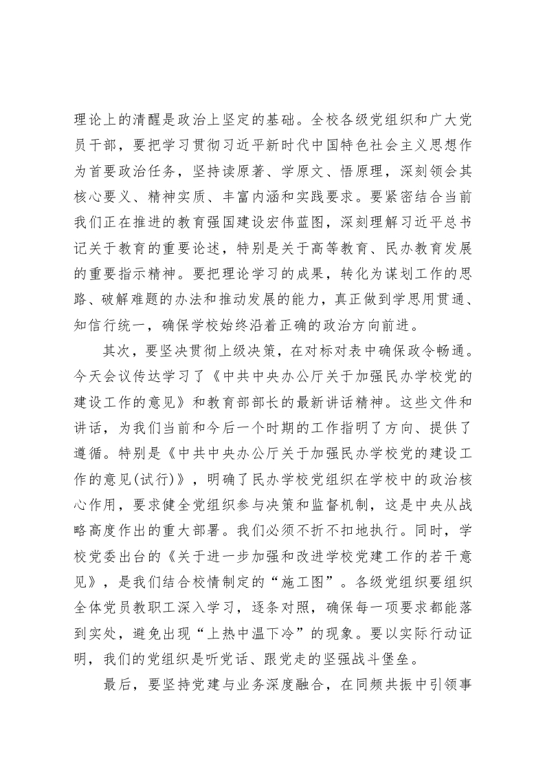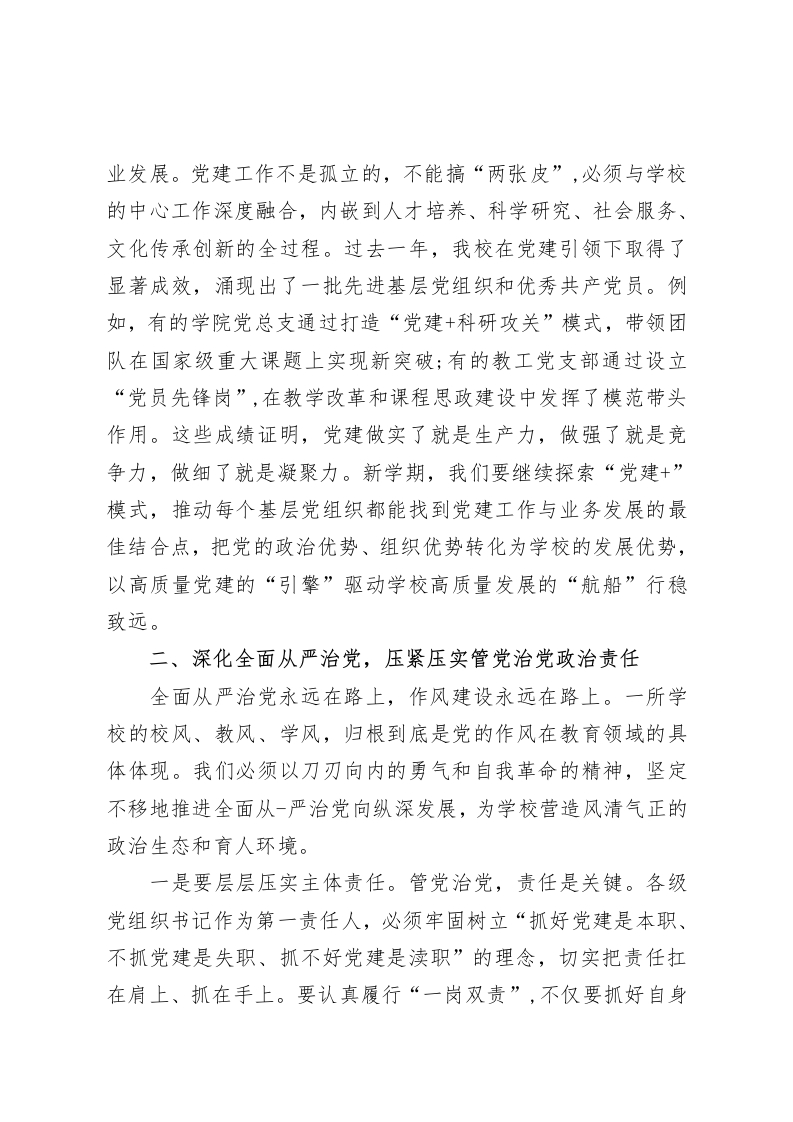 在X高校秋季学期党建工作会议上的讲话(精品)同志们:今天,我们在这里召开全校秋季学期党建工作会议,主要任务是深入学习贯彻习近平新时代中国特色社会主义思想和党的二十大精神,传达落实上级有关重要文件和会议精神,总结过去一个阶段我校党建工作的经验与不足,分析当前面临的新形势新任务,并对本学期教职工思想政治工作、巡察和审计工作以及党建各项重点任务进行全面部署。这次会议,既是一次回顾总结的评鉴会,更是一次明确方向、凝聚共识、推动落实的动员会。刚刚,几位同志分别就各自分管领域的工作进行了具体部署,提出了明确要求,我都完全同意,希望大家结合各自单位的实际情况,认真抓好贯彻落实。下面,我再讲几点意见。一、提高政治站位,以高质量党建引领学校事业高质量发展政治能力是党员干部的第一能力,旗帜鲜明讲政治是我们党作为马克思主义政党的根本要求。对于一所承担着为党育人、为国育才神圣使命的高等学府而言,党的建设更是全部工作的根本保证。我们必须深刻认识到,抓好党建是最大的政绩,也是推动学校各项事业从胜利走向新胜利的“根”与“魂”。首先,要持续深化理论武装,在学思践悟中筑牢政治忠诚。
