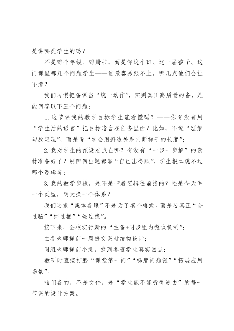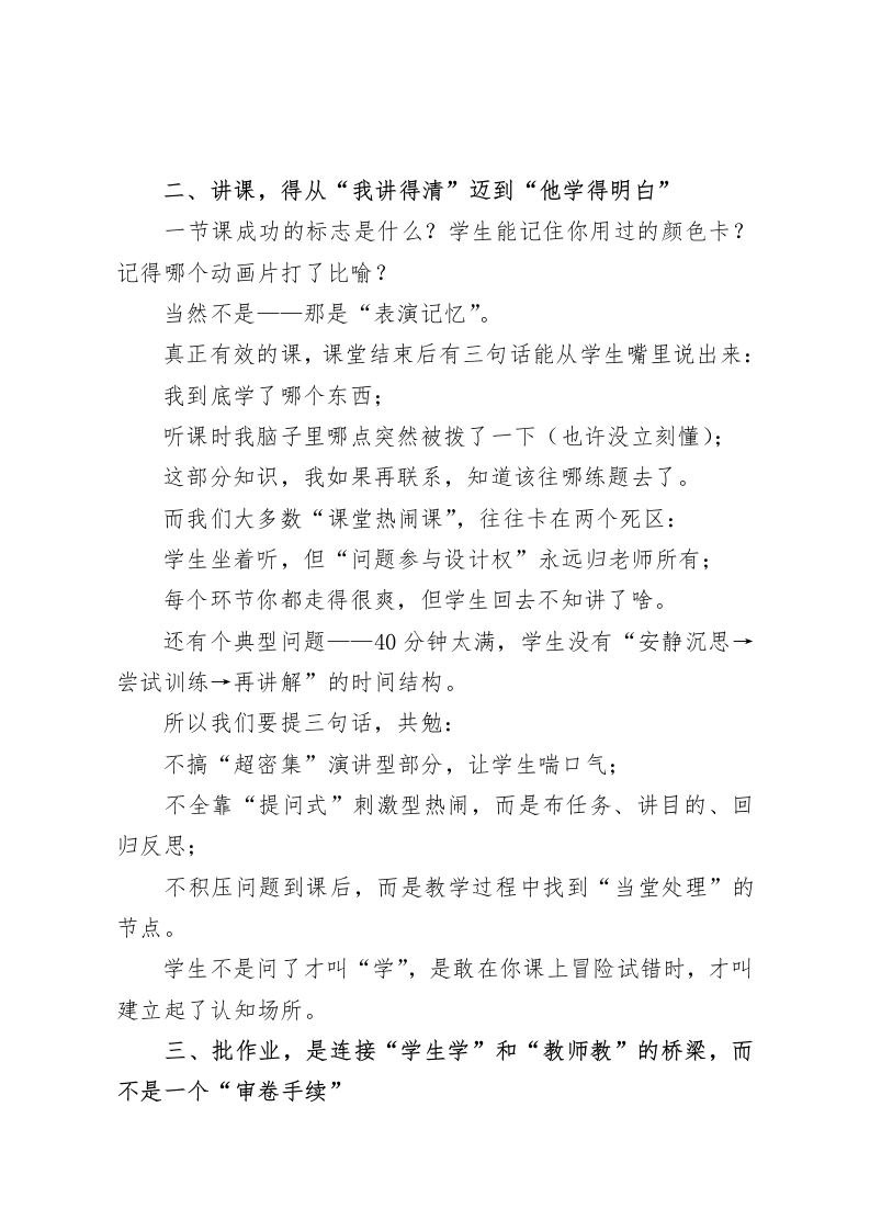 这“七件小事”决定教学质量的大成败!副校长在全体教师大会上这样说..·尊敬的各位老师、亲爱的同仁:大家下午好!我们今天集中在这里,不开评优会,也不谈“多少课题”“几项荣誉”,就聊一个话题:教学常规,怎么真正抓实、见效、不虚。这几年教育领域什么变化快?不是“作息表”,也不是“新课改”,是真正落到一线的教师心态,以及“教学主阵地”里的行为变化。在你的课堂上一教案是不是“上节课改一下继续用”?作业是不是“赶进度只看分数”?评课是不是“表扬多于建议,记一记录就完了”?学情有没有被动态处理,还是“考试见分公布了事”?那么今天这个会,我打算就这七个老词儿:“备、讲、批、辅、考、评、研”,和大家坐下来认真谈一谈一一它们不是形式,而是我们所有“教学质量”这四个字的基座。一、备课,不是复写教案,而是构一架“结构清晰的房子”有老师问我:“现在资源这么多,一课一讲义,一PPT一视频,为什么还要‘认真备课’?‘现成资料’不是已经够好吗?”这个问题,我想反过来问一句:你真正了解,自己这节课