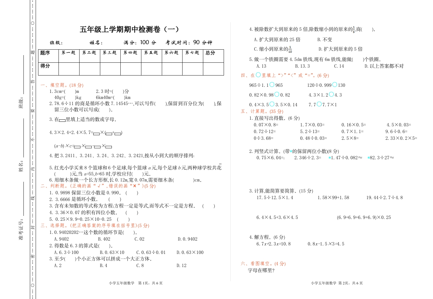 :五年级上学期期中检测卷(一)4.被除数扩大到原来的5倍,除数缩小到的原来的商(班级:姓名:满分:100分考试时间:90分钟A.扩大到原来的25倍B.不变D.扩大到原来的5倍题序第一题第二题第三题第四题第五题第六题第七题总分C.缩小到原来的品5.做一个铁圈需要4.5dm铁线,现有6m铁线,能做(个铁圈。得分A.13B.13.3C.14D.以上答案都不对:四、在○里填上“>”“<”或“=”。(6分)-、填空题。(18分)965÷1.1○965120÷0.999○1301.3cm=(m2.3时=()分0.82×0.98○0.8240g=()kg6km40m=()km4.3×1.2○4.32.78.6÷11的商是循环小数7.14545…,可以写作().保留到百分位为()保0.4×3.5○3.5×0.147.7○7.7×1留三位小数可以写成(五、计算题。35分)3.在一里填上适当的数或字母。1.直接写出得数。(6分)0.07×0.8=1.7×0.03=0.16×0.5=4.5×0.03=:4.3×2.4+2.4×5.7曰×☐☐)0.72÷125.2÷13=0.7×1.1=9.6÷0.6不0÷3.680.48÷0.032.5×8=2.33×0.2×5(a-b)Xc☐X☐□X☐:2.列竖式计算。(带*的保留两位小数(8分)4.把3.2411、3.241、3.24、3.242、3.2421.按从小到大的顺序排列0.75×6.04=:2.346÷2.3=*1.47÷0.082≈*82.3÷27≈5.红光小学买来8个篮球和6个足球,每个篮球a元,每个足球b元,两种球学校共花)元.当a55,b65时.学校应付()元.:6.用细木条做一个长方形框,长0.12m,宽0.07m,需要细木条()cm.:二、判断题。(正确的画“√”,错误的画“×”)(⑤分):1.0.9898保留三位小数是0.990。()3.计算,能简算要简算。(15分)2.3.6666是循环小数。()17.5÷12.5×1.41.58×99+1.5819.44÷2.7÷4.83.含有未知数的等式称为方程;方程一定是等式,而等式不一定是方程。(4.3.36×0.07的积有四位小数。()5.0.25×9.9=0.25×10-0.25()6.4×4.5+3.6×4.5(6.9+6.9+6.9+6.9)×0.25三、选择题。(把正确答案的序号填在括号里)(⑤分)1.0.94020202…这个数的循环节是().A.9402B.402C.02D.0.94024.解方程。(6分)2.得数是6.3的算式是().6.7x+2.3x=10.80.8x-1.5x3=4.5A.6.3÷100B.0.63×10C.0.63÷0.01D.0.63×1003.至少()个小正方体可以拼成一个大正方体。A.2B.4C.8D.12六、看图填空。(4分)字母在哪里?小学五年级数学第1页,共6页小学五年级数学第2页,共6页