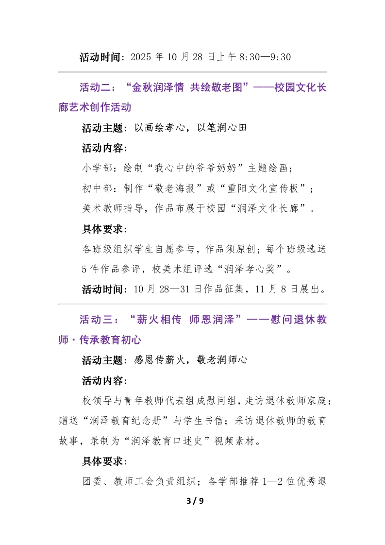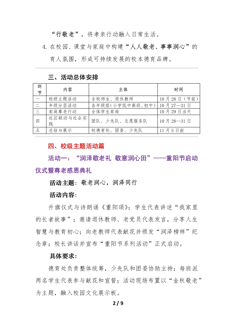 金秋“润”礼·共绘敬老“心”篇章学校2025年重阳节主题活动实施方案一、活动背景2025年10月29日是我国传统节日一一重阳节。重阳节自古便有登高望远、敬老孝亲的文化传统,是弘扬中华民族孝亲敬老美德、加强学生德育与劳动教育的重要契机。为深入贯彻《新时代爱国主义教育实施纲要》《新时代中小学德育工作指南》《义务教育课程标准(2022版)》精神,结合我校“润泽教育”办学理念,特制定本次主题为“金秋“润”礼·共绘敬老“心”篇章”的系列活动方案。本次活动以“润泽教育”核心文化为引领,贯通学校各学段,融合家庭、学校、社区三位一体的协同育人机制,打造“敬老有情·润心有爱”的校园节日文化,充分体现“一体两翼、贯通发展”的德育特色。二、活动目标1.引导学生了解重阳节的文化内涵,激发敬老、爱老、助老的情感认同,形成良好的家庭责任感。2.通过系列活动了解重阳节起源、习俗与现代意义,增强学生对中华优秀传统文化的认同与传承意识。3.通过实践性、体验性活动,引导学生从“知敬老”走向1/9