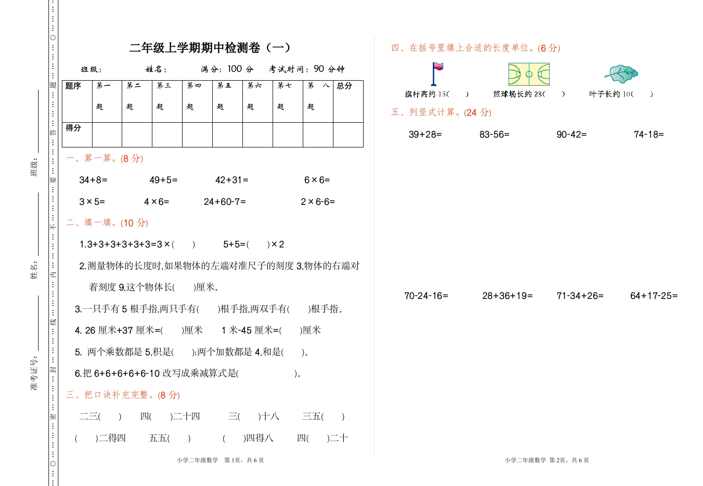 ::::二年级上学期期中检测卷(一)四、在括号里填上合适的长度单位。(6分)::班级:姓名:满分:100分考试时间:90分钟D中国题序第一第二第三第四第五第六第七第八总分旗杆高约5(篮球场长约28(叶子长约10(··:题题题题题题题五、列竖式计算。(24分):如得分39+28=83-56=90-42=74-18=一、算一算。(8分)34+8=49+5=42+31=6×6=:3×5=4×6=24+60-7=2×6-6=·:二、填一填。(10分)·:1.3+3+3+3+3+3=3×(5+5=()×2战2.测量物体的长度时,如果物体的左端对准尺子的刻度3,物体的右端对着刻度9,这个物体长()厘米70-24-16=28+36+19=71-34+26=64+17-25=..·.·..·3.一只手有5根手指,两只手有()根手指两双手有()根手指。4.26厘米+37厘米=()厘米1米-45厘米=()厘米:·:5.两个乘数都是5,积是()两个加数都是4,和是(杯6.把6+6+6+6+6-10改写成乘减算式是(:三、把口诀补充完整。(8分)二三(四()二十四三()十八三五(()二得四五五()()四得八四()二十小学二年级数学第1页,共6页小学二年级数学第2页,共6页: