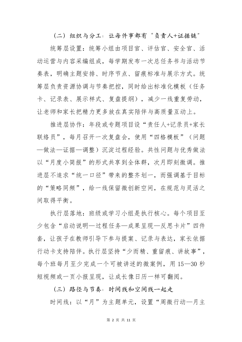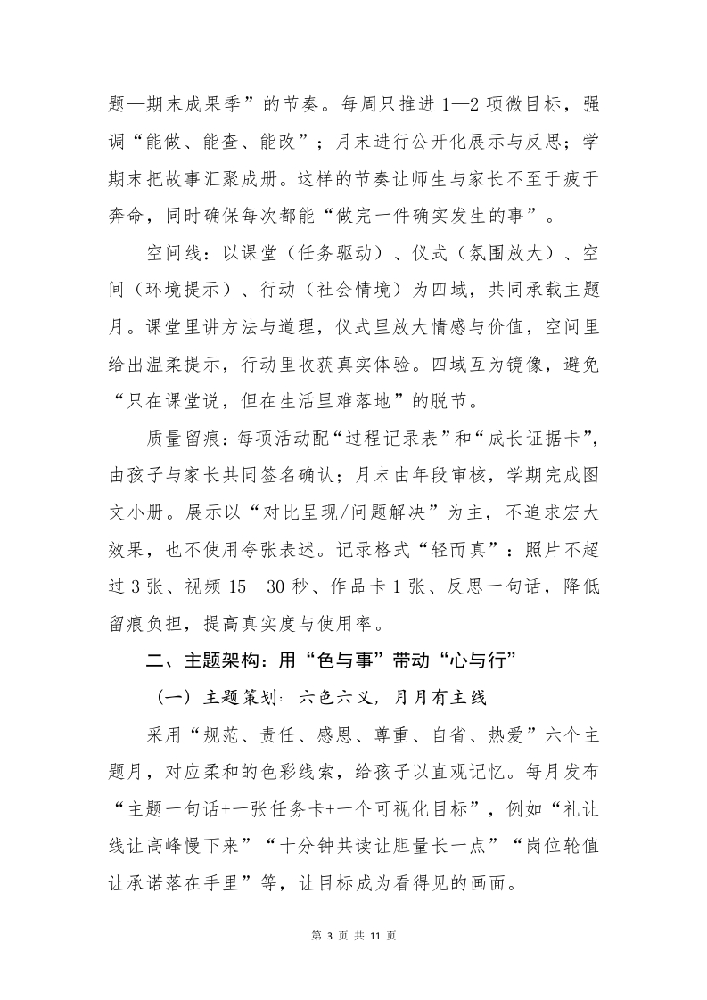 2025年德育品牌建设一心向远,行必至一、统筹总览:把协同做成一张清晰路线图(一)方向与愿景:从口号到日常的落点本方案以“心向远,行必至”为内在精神,强调把目标感放进日常,把行动力写入流程,让“更愿意问好、更懂排队秩序、更敢表达观点、更能与同伴协作、更愿承担小职责”成为看得见的变化。愿景很朴素:让每个孩子在温和而稳定的支持中,形成自信、规则意识与社会参与感。这不是一句口号,而是一种可持续的系统:在真实的课堂、在可触的空间、在家庭的陪伴与城市的情境中,持续地产生“我完成了一件小事”的体验。我们相信,稳定的小小进步,叠加起来就是确定的成长轨迹。方法只做三件事:以协同为底座、以项目为载体、以证据为语言。协同的对象包括教研协同单位、家庭与社区资源,项目的形态采用“七个一”集群式推进,证据的呈现用“过程留痕一对比呈现一简要反思”的组合。所有项目遵循“目标一任务一实施一记录一评价一改进”六步闭环,避免一次性热闹,追求行为稳定。我们减少口号宣示,增加现场画面:少做大场面堆叠,多做小切口改进;每个月都做成“能被讲述的一件真事”,积累成一张可复盘的成长地图。第1页共11页