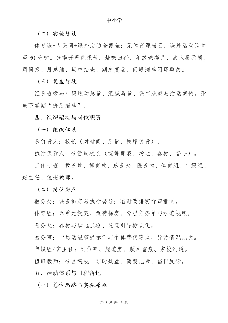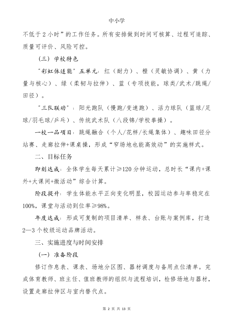 中小学落实体育运动2小时实施方案两小时动出精彩,健康路上向未来每天体育运动不低于2小时人彩虹体适能阳光体育运动三队联动一校一品项目辰纯大课间话动体育课堂课外体育活动大型主题话动慢跑、变速跑、校园热身一训练一“彩虹体适能”跳绳、田径、小球年度班级球赛月、武术操、跳绳训练趣味一放松一回整单元化实践类、传统武术春季趣味田径嘉年华安全第三线融合可轮换制运动打卡趣味运动食晨间阳光运动课间课堂短暂身体唤醒项目滚动矩阵趣味主题活动一、总体定位与基本遵循(一)工作定位坚持“健康优先、全面发展、面向全体、因人施策”的思路,将体育活动从“被动安排的课节”升级为“主动生成的校园日常”。以“两小时综合体育活动”为基本单元,贯通课前、课中、课后与家庭场域,打造“课程一活动一社团一竞赛一反馈”闭环,着力提升学生体能、运动技能与健康素养。(二)政策依据严格落实《义务教育体育与健康课程标准(2022年版)》有关目标与学段要求,执行有关部门关于“中小学生每天综合体育活动时间第1页共13页
