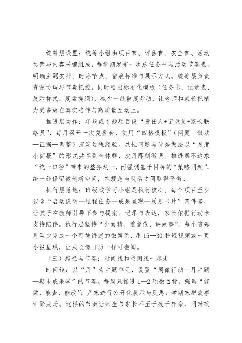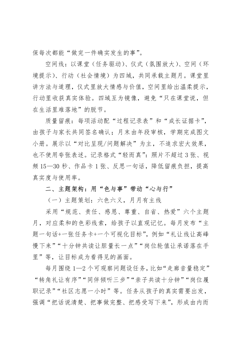 2025年德育品牌建设—一心向远,行必至一、统筹总览:把协同做成一张清晰路线图(一)方向与愿景:从口号到日常的落点本方案以“心向远,行必至”为内在精神,强调把目标感放进日常,把行动力写入流程,让“更愿意问好、更懂排队秩序、更敢表达观点、更能与同伴协作、更愿承担小职责”成为看得见的变化。愿景很朴素:让每个孩子在温和而稳定的支持中,形成自信、规则意识与社会参与感。这不是一句口号,而是一种可持续的系统:在真实的课堂、在可触的空间、在家庭的陪伴与城市的情境中,持续地产生“我完成了一件小事”的体验。我们相信,稳定的小小进步,叠加起来就是确定的成长轨迹。方法只做三件事:以协同为底座、以项目为载体、以证据为语言。协同的对象包括教研协同单位、家庭与社区资源,项目的形态采用“七个一”集群式推进,证据的呈现用“过程留痕一对比呈现一简要反思”的组合。所有项目遵循“目标一任务一实施一记录一评价一改进”六步闭环,避免一次性热闹,追求行为稳定。我们减少口号宣示,增加现场画面;少做大场面堆叠,多做小切口改进;每个月都做成“能被讲述的一件真事”,积累成一张可复盘的成长地图。(二)组织与分工:让每件事都有“负责人+证据链”