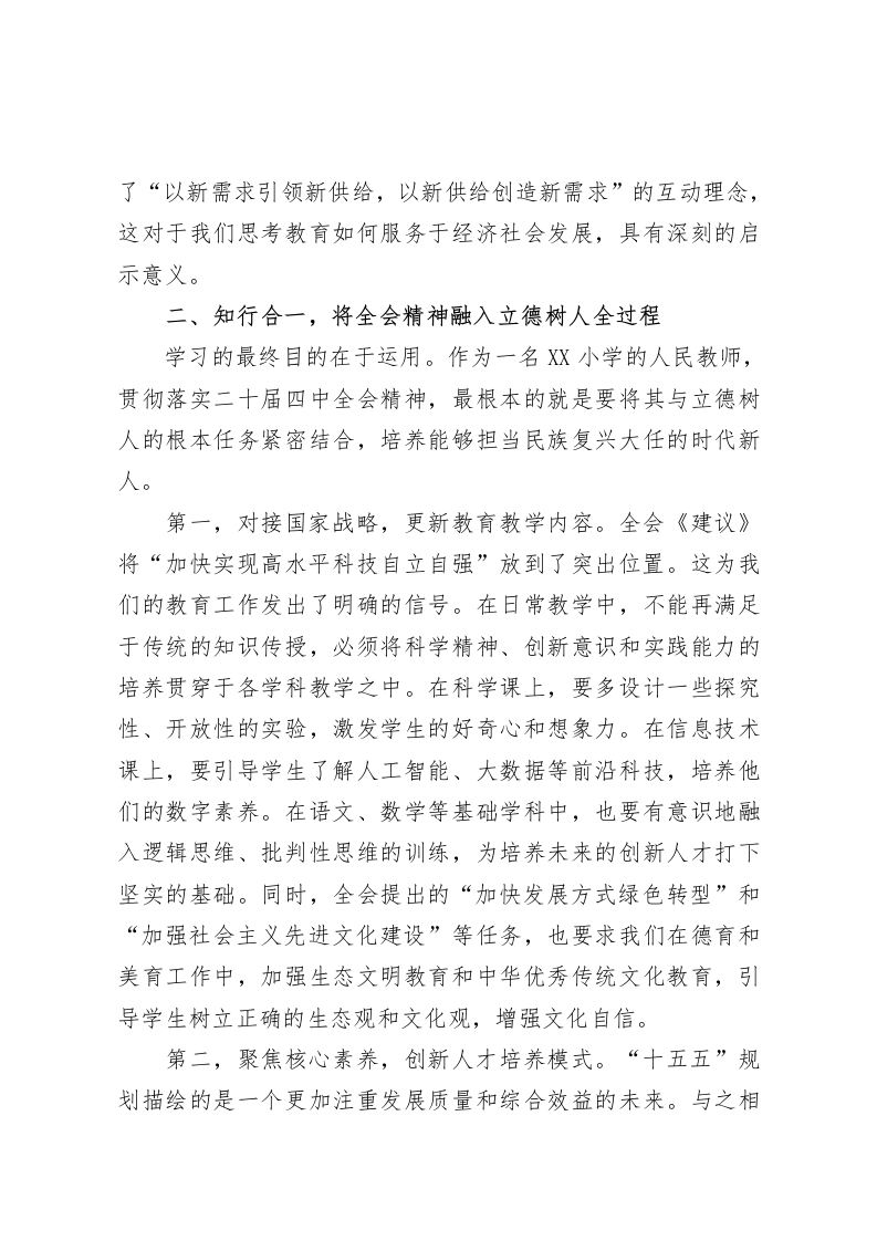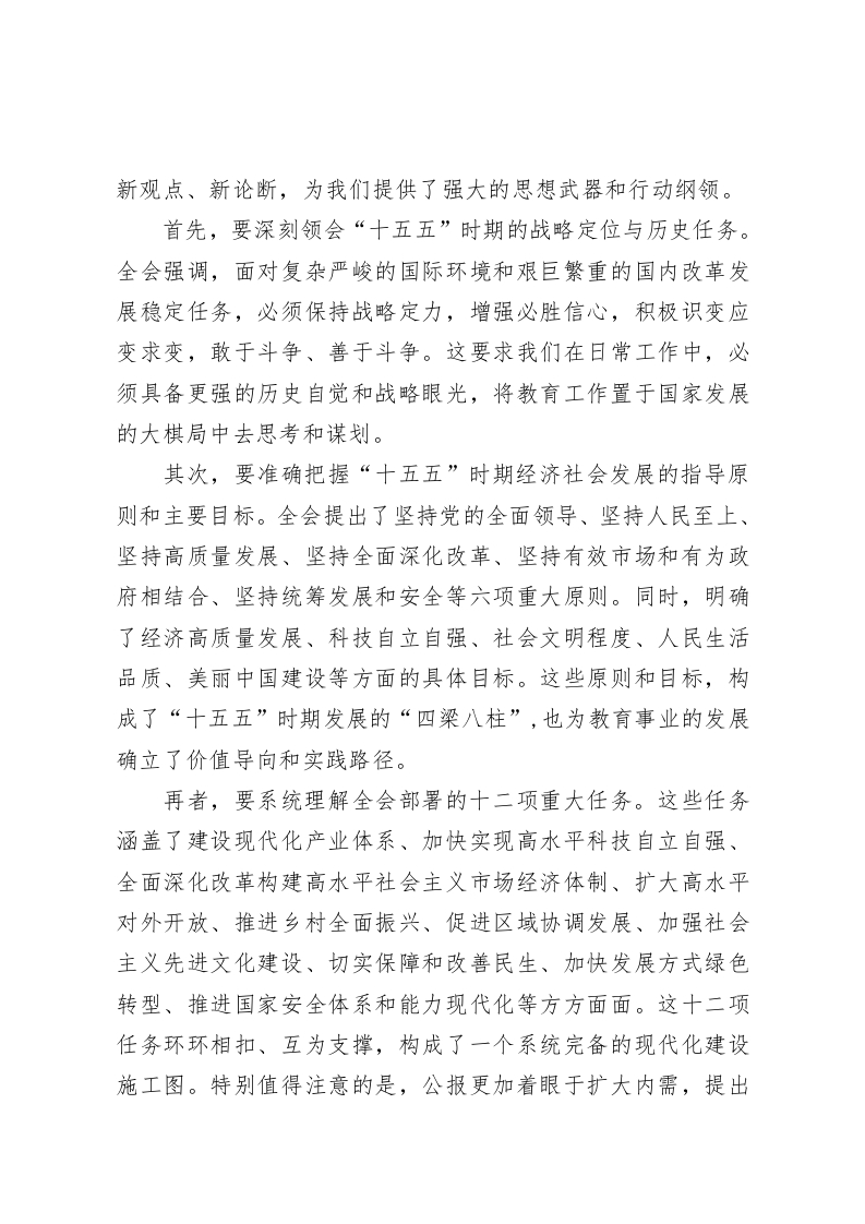 教师学习党的二十届四中全会精神心得体会(精品)金秋十月,举世瞩目的中国共产党第二十届中央委员会第四次全体会议在北京胜利闭幕。作为一名身处教育一线的普通党员教师,我怀着激动的心情,第一时间学习了全会公报全文并认真研读了会议审议通过的《中共中央关于制定国民经济和社会发展第十五个五年规划的建议》。这次全会是在中华人民共和国成立76周年之际,在向第二个百年奋斗目标进军的关键节点上召开的一次具有全局性、历史性意义的重要会议。全会公报高屋建瓴、思想深邃,为未来五年乃至更长时期国家的发展指明了前进方向、确立了行动指南。全会深刻指出,“十五五”时期是基本实现社会主义现代化夯实基础、全面发力的关键时期,具有承前启后的重要地位。这一重要论断,清晰标定了未来五年在中华民族伟大复兴历史进程中的关键坐标。学习全会精神,犹如登高望远,国家的宏伟蓝图与个人的奋斗足迹在时空的交汇点上激荡共鸣。作为一名人民教师,我深感使命光荣,责任重大,必须将全会精神内化于心、外化于行,将其转化为推动教育高质量发展的生动实践。一、深学细悟,准确把握全会精神的核心要义党的二十届四中全会精神内容丰富、博大精深,蕴含着一系列新思想、新论断、新部署。全会公报提出了一系列新概念、