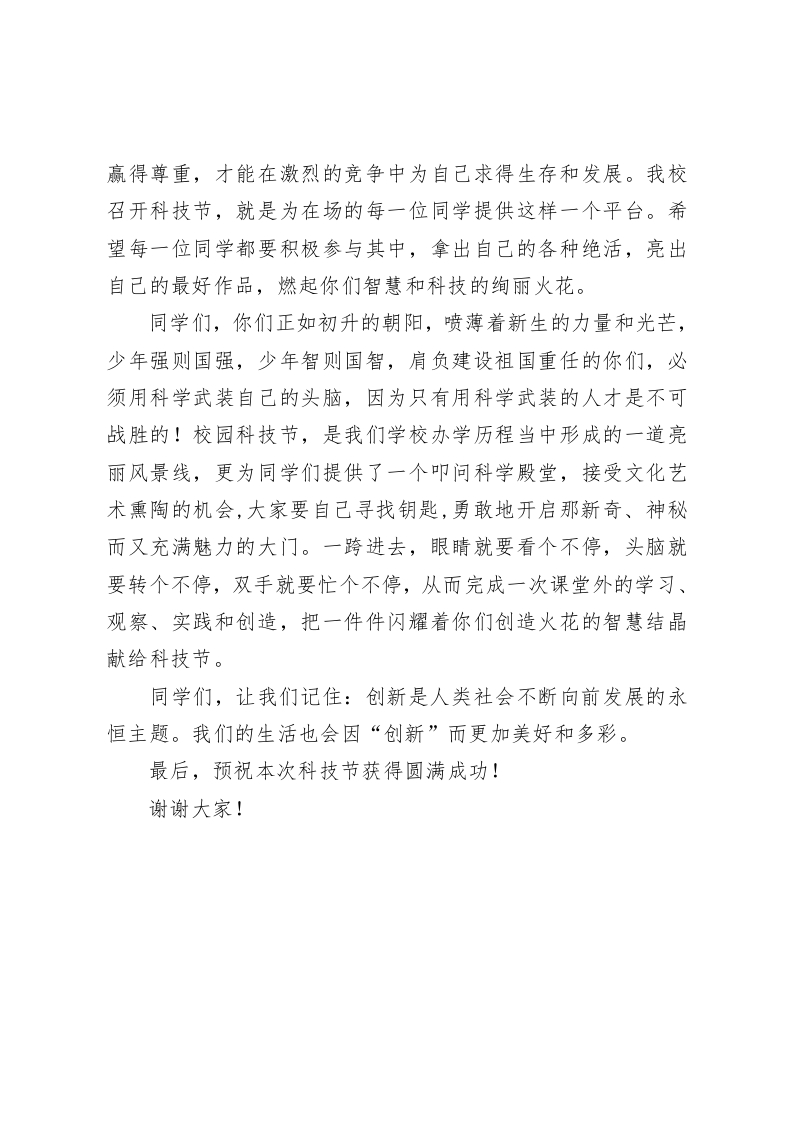 校园科技节开幕式,校长发言创新是人类社会不断向前发展的永恒主题。我们的生活也会因创新而更加美好和多彩此内容为付费资源,请付费后查看