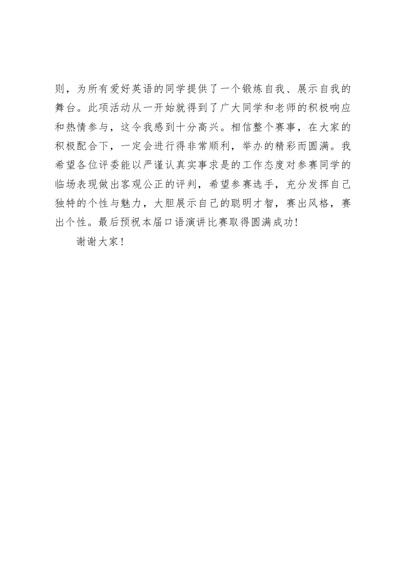校园英语口语大赛,校长讲话英语学习的过程是艰苦的,展示英语学习的成果却是快乐的各位老师,同学们大家下午好!由校委会研究决定,教导处规划实施,英语教研组承办的xx学校第X届英语口语演讲比赛即将在这里隆重举行。首先我代表校委会,向与会的老师和同学表示热烈欢迎,对筹备和组织这一赛事的英语教研组和相关老师、参与同学表示衷心感谢。英语学习是我们和外界交流的一门重要的语言工具。学好英语,不仅在于掌握了一种工具,一门技能,更重要的是打开了通向外部世界的大门,让我们的眼界更宽,视野更广,更有利于丰富自己、完善自己、快乐自己。英语学习不仅要在课堂上学习和运用,更重要的是在生活和活动中提高、完善。为了推动英语口语教学,我校已经成功举办了四届口语比赛,极大的增强了广大同学学习英语的兴趣和参加社会实践活动的能力,在此基础上我们举办了今天这次英语口语演讲比赛。英语学习的过程是艰苦的,展示英语学习的成果却是快乐的。只有参与其中,才会收获更多,快乐更多,让我们的英语学习在艰苦中焕发生命的活力。希望同学们能通过参与类似口语演讲比赛这样的技能比武活动求知,在求知过程中应用,在应用过程中提高。这次比赛将本着“培养兴趣、增强信心、树立榜样”的原