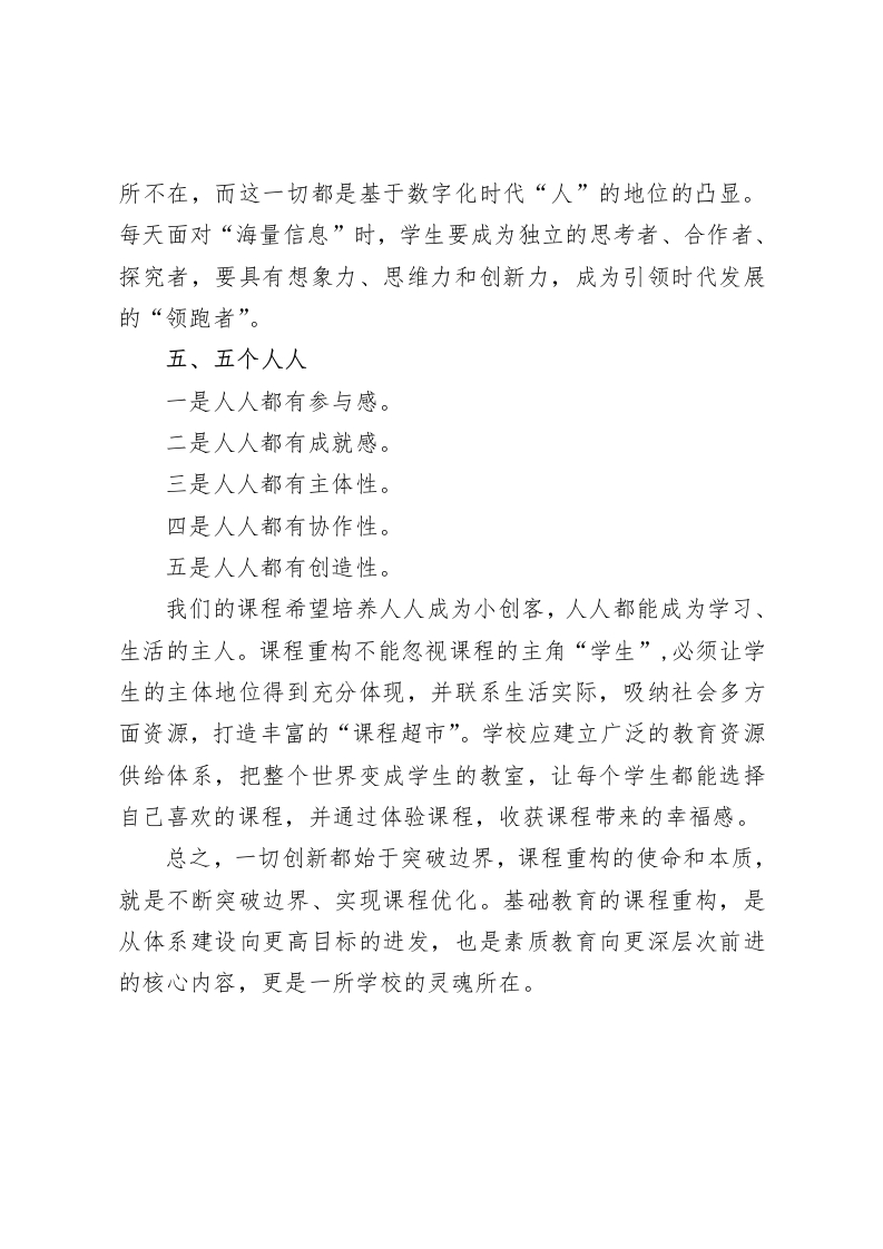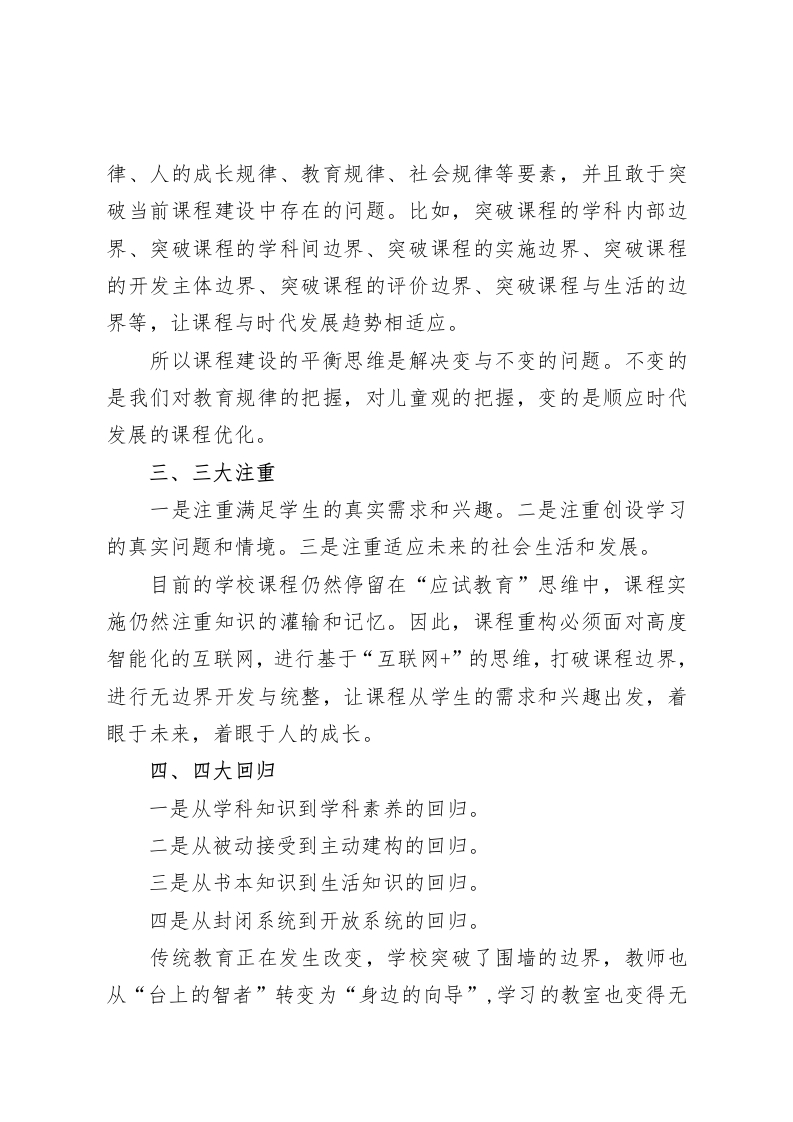 校长汇报对课程建设的思考各位专家,各位领导,各位同仁:今天非常高兴在这里与大家分享课程建设的思考。首先请允许我引用一句丘吉尔的名言作为开篇:“欲求新,则求变。欲求完美,求常变。”。是啊,当今世界,一切都在变。以互联网为核心的新能源、新材料、新技术高度交融的新工业革命的到来,不断地改变人类的生活方式、管理方式、学习方式,突破时间和空间的限制,进入一种无界限的新时空,使未来的教育呈现生活化、生命化、个性化特征。面对现状,学校管理者如何适应这个潮流?对于学校建设来说,唯有从学校课程着手,突破课程边界,构建新时代的“学校课程”,才能不被时代所淘汰。下面,我用“一二三四五”来汇报我对学校课程建设的初浅思考:一、一个核心:立德树人立德树人揭示了教育的本质是培养人;强调了德性成长在人的全面发展中的重要地位。构建学校课程应始终以立德树人为灵魂,回归教育本源,回归儿童生活,促进学生身心健康发展。我们的课程建设一定要坚守“立德树人”的核心,紧紧围绕这个核心来思考、来布局、来实施。二、两个平衡:坚守与创新的平衡我们的重构课程,不是任性而为,是在注重课程无边界开发与统整的过程中,坚守一些“不变”的东西。比如,自然规