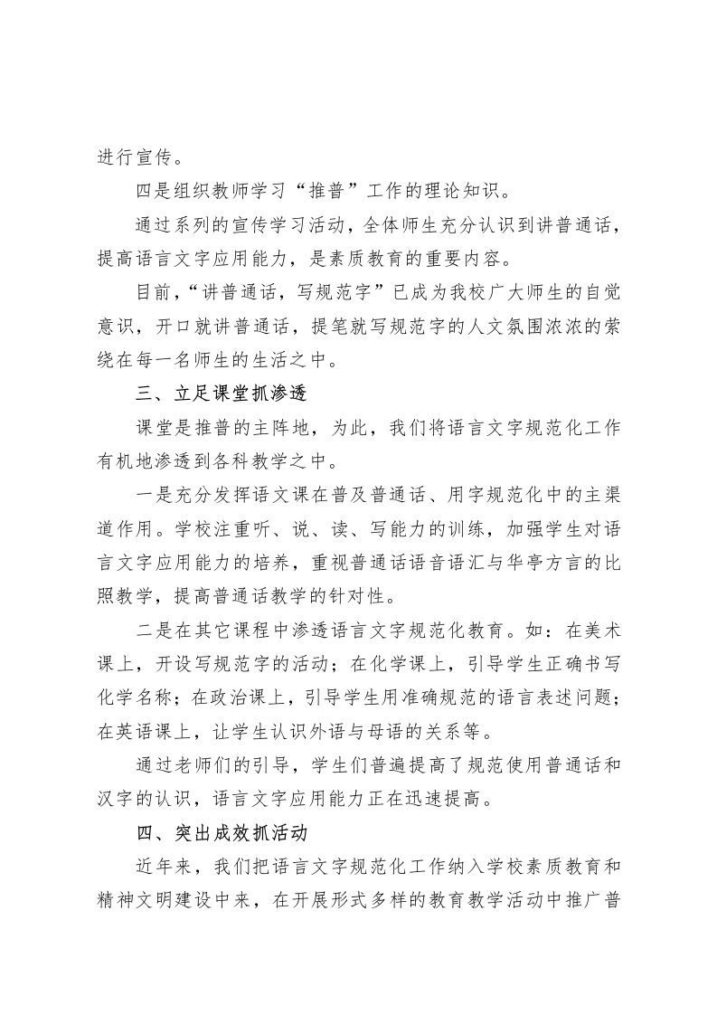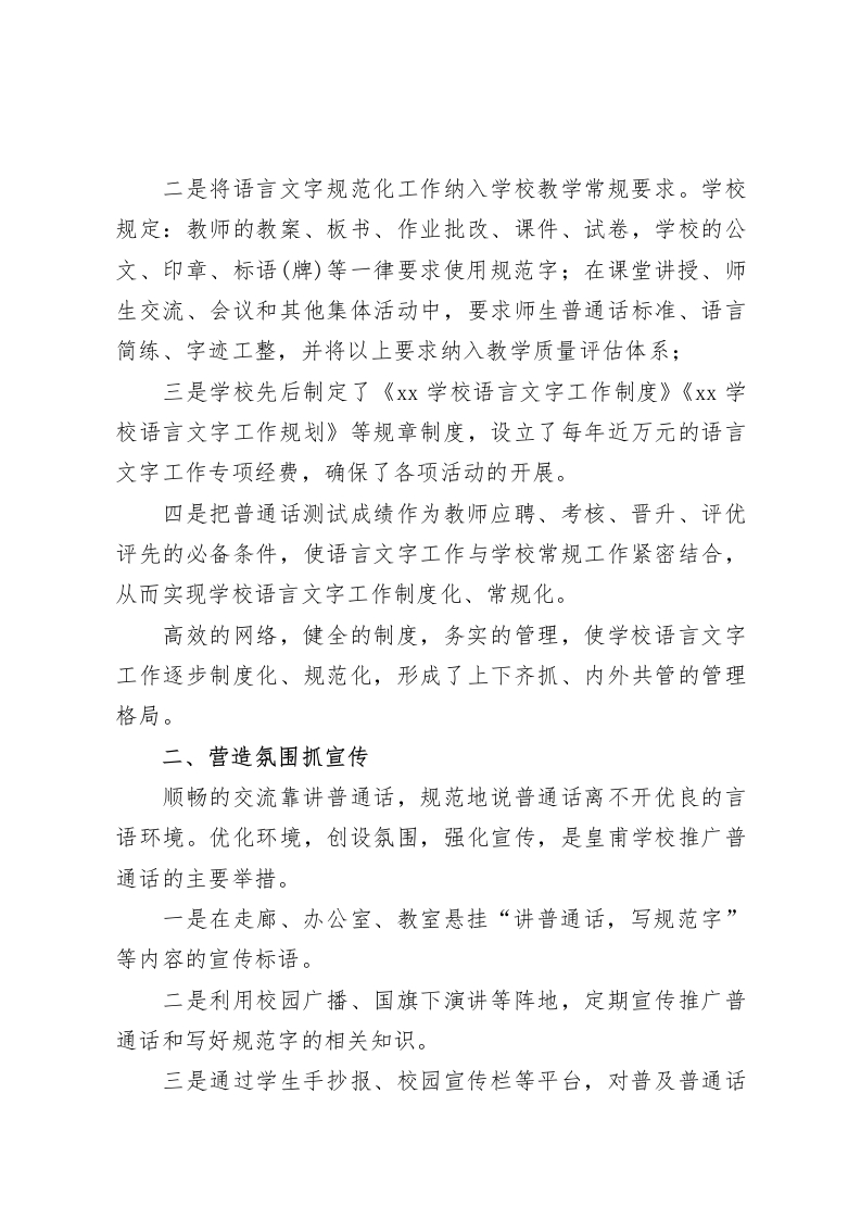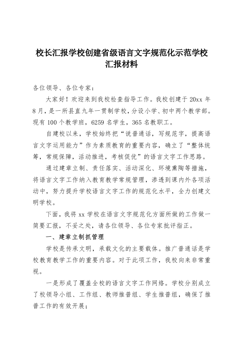 校长汇报学校创建省级语言文字规范化示范学校汇报材料各位领导、各位专家:大家好!欢迎来到我校检查指导工作。我校创建于20xx年8月,是一所县直九年一贯制学校,分设小学、初中两个教学部。现有100个教学班,6259名学生,365名教职工。自建校以来,学校始终把“说普通话,写规范字,提高语言文字运用能力”作为素质教育的重要内容,确立了“整体统筹,常规保障,活动推进,考核促优”的语言文字工作思路。通过建章立制、责任落实、活动深化、环境熏陶等措施,将语言文字工作纳入教育教学常规管理,渗透到课内外各项活动中,努力提升学校语言文字工作的规范化水平,全力创建文明学校。下面,我将xx学校在语言文字规范化方面所做的工作做一简要汇报,不妥之处,请各位领导、各位专家批评指正。一、建章立制抓管理学校是传承文明,承载文化的主要载体。推广普通话是学校教育教学工作的重要内容。对于此项工作,我校向来非常重视。一是形成了覆盖全校的语言文字工作网络。学校分别成立了校领导小组、工作组、教师推普组、学生推普组,确保了推普工作的有效开展: