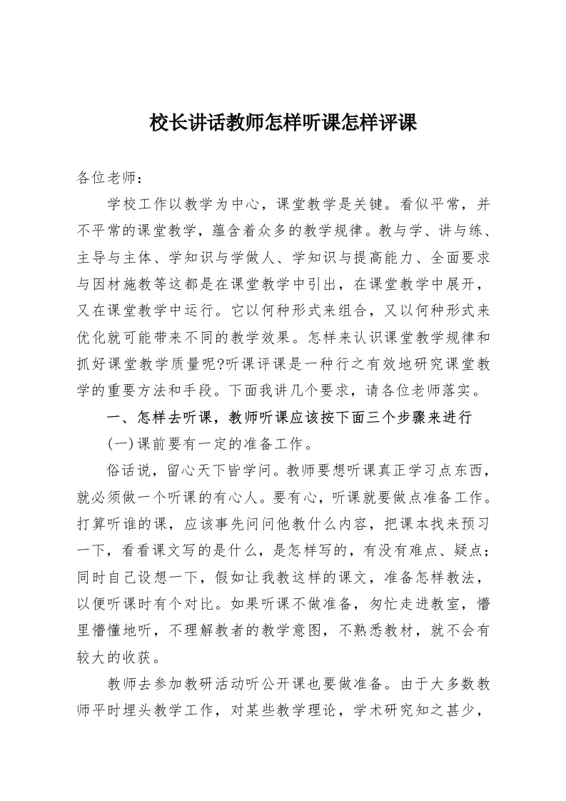 校长讲话教师怎样听课怎样评课各位老师:学校工作以教学为中心,课堂教学是关键。看似平常,并不平常的课堂教学,蕴含着众多的教学规律。教与学、讲与练、主导与主体、学知识与学做人、学知识与提高能力、全面要求与因材施教等这都是在课堂教学中引出,在课堂教学中展开,又在课堂教学中运行。它以何种形式来组合,又以何种形式来优化就可能带来不同的教学效果。怎样来认识课堂教学规律和抓好课堂教学质量呢?听课评课是一种行之有效地研究课堂教学的重要方法和手段。下面我讲几个要求,请各位老师落实。一、怎样去听课,教师听课应该按下面三个步骤来进行(一)课前要有一定的准备工作。俗话说,留心天下皆学问。教师要想听课真正学习点东西,就必须做一个听课的有心人。要有心,听课就要做点准备工作。打算听谁的课,应该事先问问他教什么内容,把课本找来预习一下,看看课文写的是什么,是怎样写的,有没有难点、疑点:同时自己设想一下,假如让我教这样的课文,准备怎样教法,以便听课时有个对比。如果听课不做准备,匆忙走进教室,懵里懵懂地听,不理解教者的教学意图,不熟悉教材,就不会有较大的收获。教师去参加教研活动听公开课也要做准备。由于大多数教师平时埋头教学工作,对某些教学理论,学术研究知之甚少,