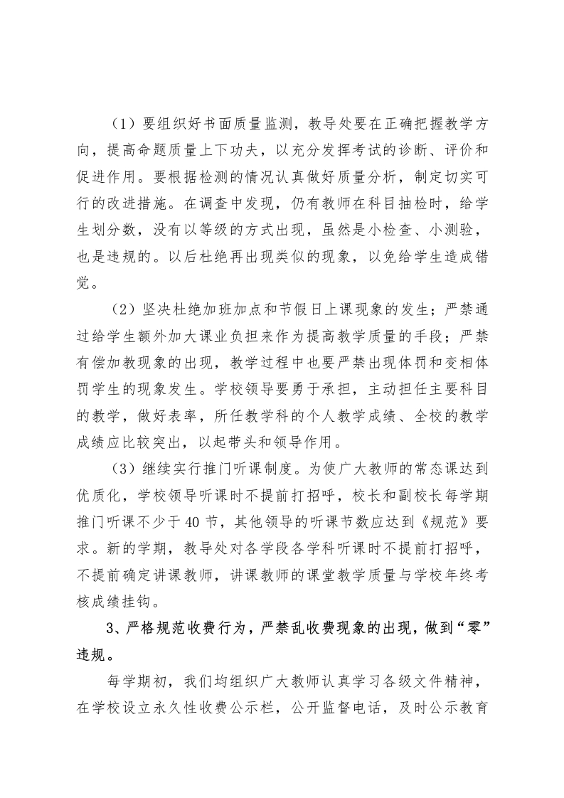 校长讲话强化学校管理,规范办学行为。全面推进学校教育的健康有序发展各位领导、老师们:今天学校结合对学生问卷调查的情况,召开这次全体教职工会议,并传达进一步学习各级教育行政部门下发的有关全面规范学校办学行为、推进素质教育的文件精神,使我校教育教学健康和谐有序的发展。下面,我就这方面的工作说几点要求:1、进一步规范课程管理。学校要按照国家、省、市教育行政部门下达的课程计划,开齐课程、开足课时,尤其要抓好地方课程和校本课程的开齐开足。对学校开设的实践活动、民族团结教育、心理健康教育、安全教育、传统文化教育、环境教育等科目的教学要进一步规范和完善,使学生真正通过这些科目的学习,促进学生全面的发展阶段。下一步,教导处通过召开地方课程等教学研讨会、校本课程开发现场会等形式,规范地方课程和校本课程管理,提高地方课程和校本课程的教学质量。同时,制定具体的措施,加大对这些科目教学的考核、考查力度,真正使我们的老师把原先认为“可有可无”的观念转变过来。针对调查中出现的个别教师调课比较随便的问题,教师在增加自由责任感的同时,教导处要不定时的进行抽查,对再出现的类似问题要进行通报,并计入个人考核。2、进一步规范教学质量管理。