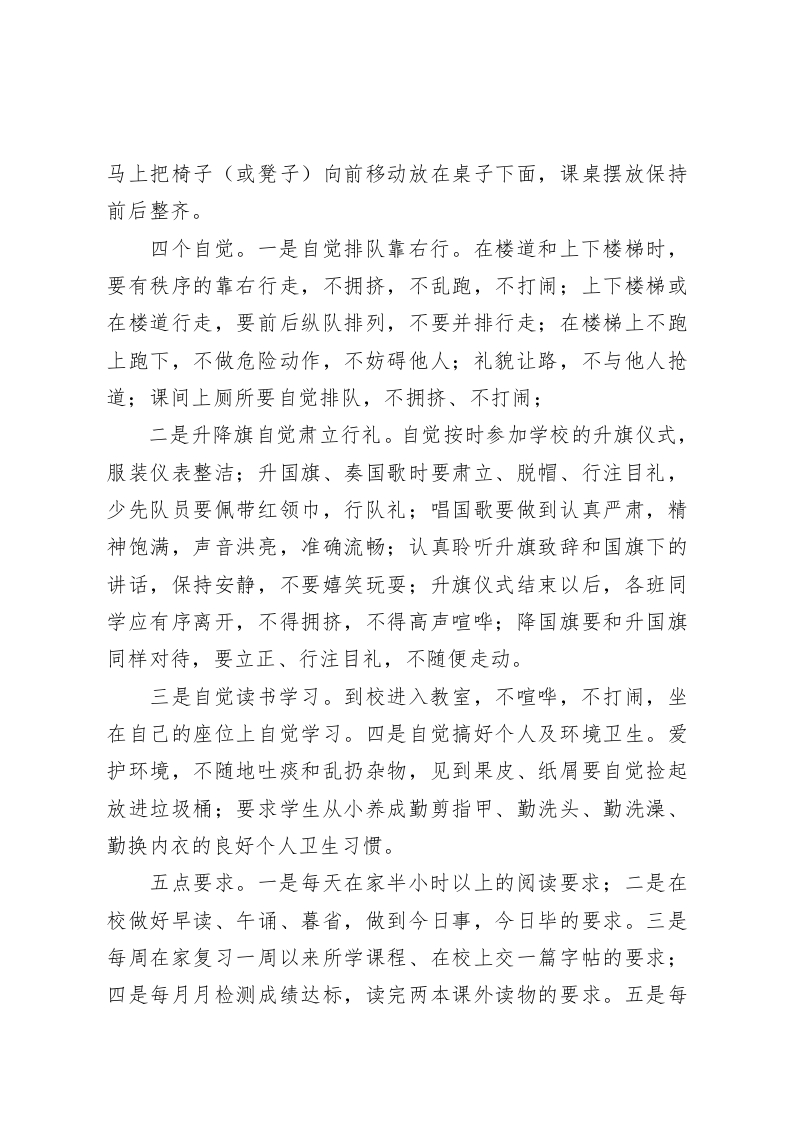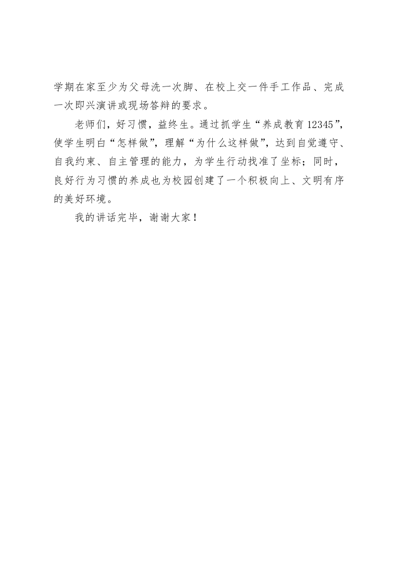 校长讲话抓好学生养成教育,成就精彩人生老师们:播种一种习惯,收获一种行为;播种一种行为,收获一种性格;播种一种性格,收获一种命运。“十年树木,百年树人”德育教育也非一日之功。小学阶段正是人生播种的时期。所以,养成教育是学校德育工作的重中之重,也是班主任工作的核心学生成功人生的基石。因此,学校要坚持立德树人根本任务,全力实施学校养成教育个性化模式,全方位构建学生行为习惯养成教育体系,为成就学生精彩人生不懈努力。养成教育如何抓?那些大话套话我们就不再阐述,多年工作经验下来,我认为主要做好以下5点工作,会后请各位老师,尤其是班主任老师贯彻落实。一声问候。遇见领导、老师、同学、及来宾时能面带微笑主动问好,放学时,要向老师、同学道别,说声再见。二个轻声。在楼道、楼梯行走时,要轻脚慢步。自觉排队,不跑跳、不打闹、不喧哗,不在楼内进行任何游戏活动。诸如:追逐打闹、球类游戏、投沙包、玩纸牌、猜拳和踢毽子等;在楼梯内行走时不摸墙、不踹墙,不滑栏杆、不拥挤,无特殊情况不在楼道、楼梯上滞留,与人交谈要轻声并使用普通话。三处整齐。一是上操、集会时队伍整齐。二是眼保健操、课间操动作整齐。三是桌凳、文具等物品摆放整齐。学生每次离开座位前都要把文具摆放整齐(课桌的左上角)。起立离开后