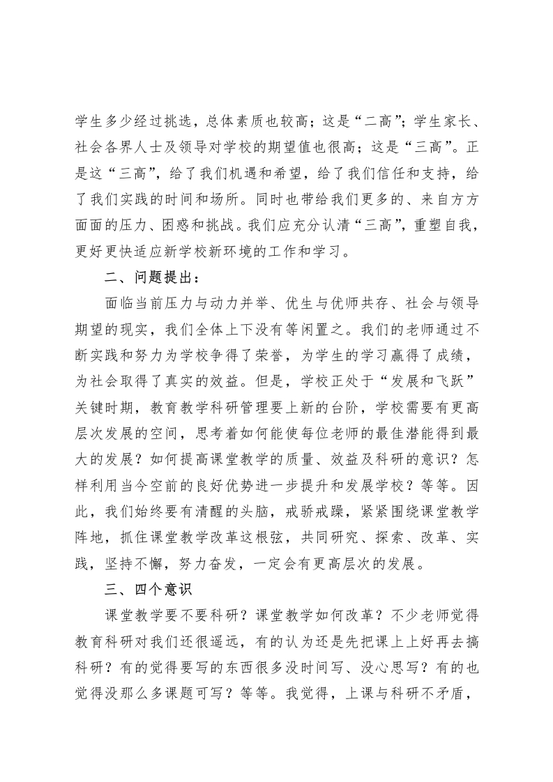 校长教育科研经验交流会上发言希望老师们转变观念、提升自我、培养能力,以科研领先,积极投入到学校的教育改革中各位老师:学校科研室安排的“教育理念大家谈”及“网上聊”,大家都积极参与和投入,聊也好,谈也好,我觉得有新颖、有思路、有个性,有的老师的确在思考、在实践、在总结。应该说,开辟这个科研场所,形式好,不拘一格,让大家点滴的火花时而点燃,马上迸发,能找到知音,达成共识,起到共同进步的作用。“聊“和”谈“的中心问题是什么?对教学的想法、做法或思考或尝试或经验。总之,大家关心的是教育教学的改革,说到底,我们谈的、做的、想的都离不开教学,而教学又离不开课堂教学,40分钟的课堂教学又恰恰是教师和学生共同的、双边的活动。因此,结合自己的学习、认识、思考和实践,谈谈自己的体会,和大家一起共同学习。一、现状分析:我们的学校是一所年轻的、有生命力、有朝气的、有美好的发展前途的在社会上有一定影响的学校。一所好的学校除了有个好校长、有先进的办学思想和管理水平外,更重要的是要一支有潜力的、有智慧的、有发展的肯吃苦耐劳、能干有实效、愿奉献敬业的教师队伍。就目前我们学校的师资队伍状况总体不错,师资素质高;这是“一高”;我们的学生来自各区及市,