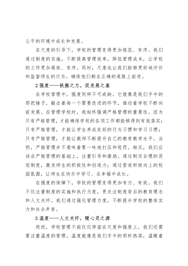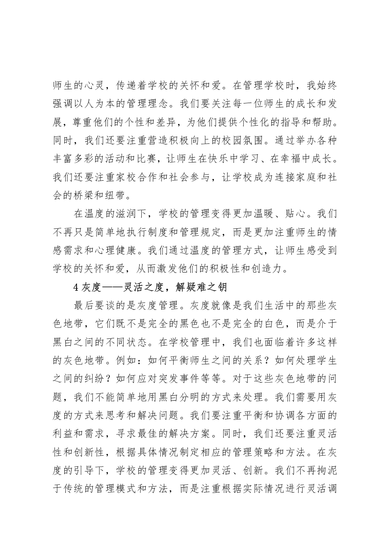 校长领导力论坛,交流发言我们要将这四个维度融入日常工作中去,让学校管理更加贴近师生实际需求和社会发展趋势各位领导、各位同仁:大家好!一个学校的兴衰荣辱牵连着千家万户的心,作为校长就是要沉下心来为学校的事业着想,为莘莘学子着想,为现在、未来学校的切身利益着想,扎扎实实做出几件事来。一所学校的发展,不仅取决于优秀的师资力量和教学资源,更在于有一个能够凝聚人心、引领方向、激发活力的管理团队。一个好校长就是一所好学校,那么,一个会带团队的校长,应该具备哪些特质呢?在我看来,以下五点至关重要。1尺度一一精准之尺,定规矩之界当我们谈及学校管理,尺度无疑是基础。它就像是我们手中的那把尺子,衡量着学校的每一项工作,确保它们都能在正确的轨道上运行。对于校长来说,制定和完善学校的规章制度,就是给学校的发展搭建了一个稳固的框架。这个框架不仅为学生提供了明确的行为规范,也为教师指明了教学方向。在管理学校的过程中,我深知尺度的重要性。它不仅仅是一纸文件、一条规定那么简单,更是学校文化的体现,是教育理念的实践。我们通过制定科学的制度,将教育理念融入其中,让每一位师生都能感受到学校的文化底蕴和人文关怀。同时,尺度也确保了学校管理的公平性和公正性,让每一位师生都能在一个公正、