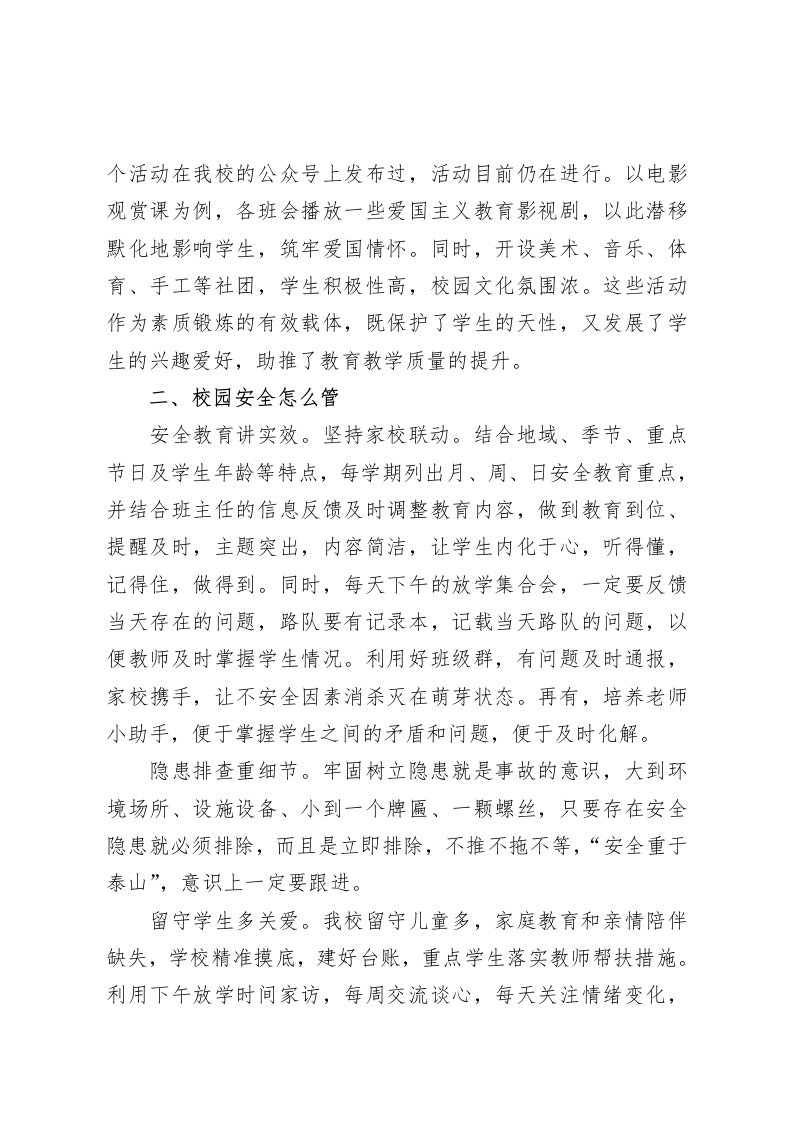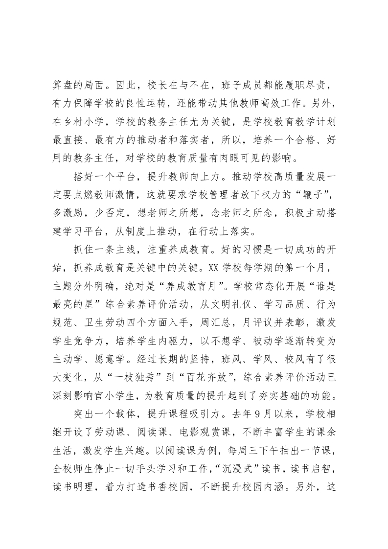 校长论坛发言为办山区人民满意的家门口的好学校而努力奋进尊敬各位领导、各位老师:大家下午好!很荣幸能与大家一起交流探讨,我的报告题目是《行胜于言一以实干助推乡村教育高质量发展》。“行胜于言”四字来源于清华大礼堂前草坪南端的日晷上的铭言,“行胜于言”不是不言,而是言必求实,以行证言。“行胜于言”同样也是XX学校“重视实干”的态度与理念。下面我就三个方面与大家予以交流:一、教学质量怎么提坚定一个核心,团结领导班子。一所学校的教学质量要提升,管理是关键,校长要真诚大气,心无旁骛,校长要能坐得住板凳,俯下身去,静下心来,成为“自律者”,踏踏实实,为教育做出自己应有的贡献。因此,在X学校,“行胜于言”,绝不是口号,也绝不是“作秀”,校长带头做,绝不游离于制度之外,从而为团结班子成员打下坚实基础。此外,一定要充分尊重、相信班子成员,敢于放手让中层去做,要让中层觉得自己被肯定、被认可,只有在不断做的过程中,发现问题,改正问题,才能成长。我调任X学校以后,集中班子成员,从学校实际出发,各处室相互交流,捋思路,定策略,学期初教师会上各处室负责人将分管的工作计划全盘呈现,自然不会出现各行其是,各打
