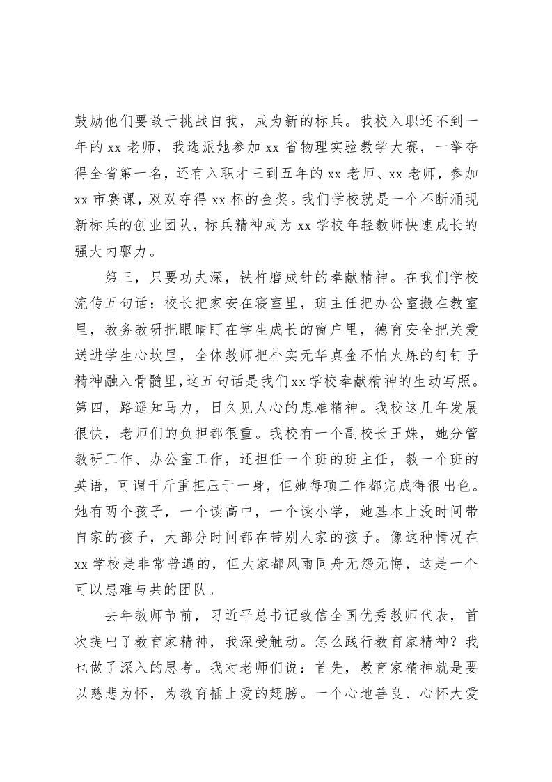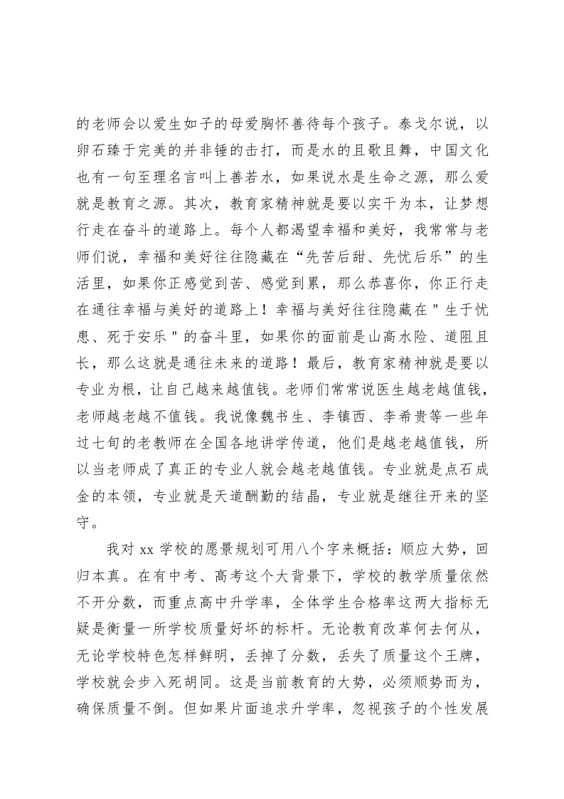 校长论坛发言以文化引领学校发展尊敬的各位领导、同仁:非常荣幸能站在这里向大家汇报交流,讲的不当之处敬请各位批评指正。我是一个行胜于言的实干主义者,不善于协调,只知默默地工作。但我很幸运,所有的努力都被组织和领导看在眼里,放在心上。我感到很惊喜,很意外,更多的是感动。因而我更加坚信,这个时代,你不用担心,只要你狠狠地努力,就会被看见。在xx学校我一直坚持做文化,我认为,要让一所学校行稳致远,只有文化的力量可以做到。学校开办十年来,我们教师团队一直以勤为范、与勤为伴,铸造了四种精神文化:第一,朴实无华,真金不怕火炼的钉钉子精神。我们学校有一位年过五旬的女老师,她叫xx,有一次上班途中出了车祸,手被撞断了,做了手术,埋了钢板,钉了钉,但她仍然坚持进教室上课,有一次在黑板上写字时钢钉松动,脱落出来,她就用手掌将钉子拍进去继续上课,同学们都深受震撼,深感心痛。有一种优秀叫坚守初心,将优秀保持三年、五年可以做到,将优秀坚守一辈子,太难了,但Xx做到了,她的钉钉子精神成为xx学校师德师风建设的精神高地。第二,敢为人先,初生牛犊不怕虎的标兵精神。我们Xx学校以年轻老师居多,每年都有新入职的年轻老师,为了引领这些年轻的小伙伴们快速成长,我
