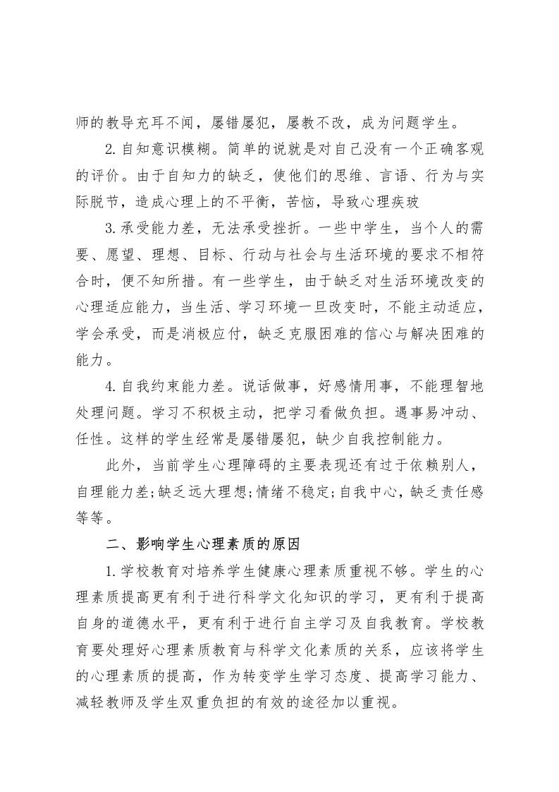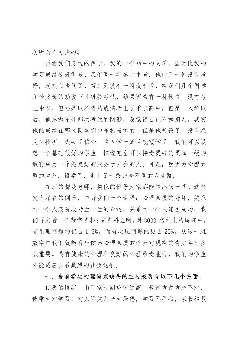 校长论坛演讲浇树浇根,育人育心各位领导,各位同仁:大家好!很高兴有这样一个学习的机会,我演讲的题目是:浇树浇根,育人育心。现在大家都在讲素质教育,学生德智体美劳全面发展的教育思想已成为每个教师对教育对象培养的自觉要求。但是,除对智育的认识比较统一外,对其它几育的认识上,教师的个体差异是很大的,在这里我想要说的是,其实,五育的教育固然重要,但是,除此之外,人们普遍忽略了对当前的学生来说非常重要的一项,就是对学生的心理素质教育。心理素质是人在先天生理基础上,在个体与客观外界相互作用中产生、发展起来的比较稳定的心理特征、属性和品质,主要表现在人的智力是否正常,情绪是否稳定,意志是否坚强,反应是否适度,社交是否和谐,个性是否健全,以及能否适应环境等方面。为什么我要强调这一个方面呢,我们教育学生是要培养他们成材的,苏轼曾经说过这样一句话:“古之立大事者,不惟有超世之才,亦必有坚韧不拔之志。”我想大家都能听出这句话的意思,可以简单的这样理解,成大事,有超世之才并不是必要条件,如果才能平庸,通过努力,坚持不懈的去奋斗也是可以成功的。可见,才能大小放在其次,坚忍不拔之志却是通向成