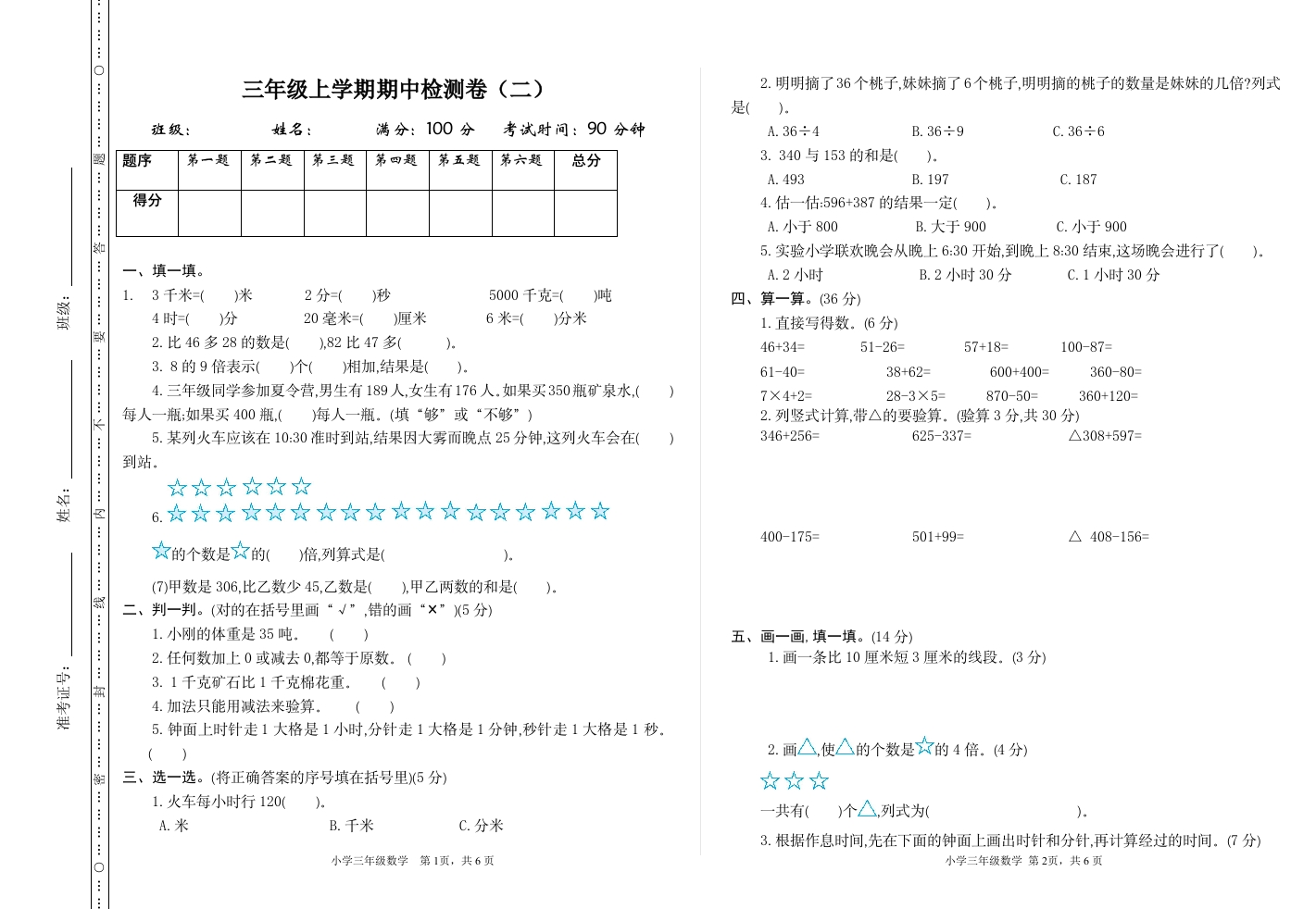 :三年级上学期期中检测卷(二)2.明明摘了36个桃子妹妹摘了6个桃子,明明摘的桃子的数量是妹妹的几倍?列式是()。班级:姓名:满分:100分考试时间:90分钟A.36÷4B.36÷9C.36÷6题序第一题第二题第三题第四题第五题第六题总分3.340与153的和是()。A.493B.197C.187得分4.估一估596+387的结果一定().A.小于800B.大于900C.小于9005.实验小学联欢晚会从晚上630开始,到晚上8:30结束,这场晚会进行了(:一、填一填。A.2小时B.2小时30分C.1小时30分1.3千米=(米2分=(秒5000千克=()吨四、算一算。36分)4时=()分20毫米=()厘米6米=(分米1.直接写得数。(6分)好2.比46多28的数是(),82比47多(46+34=51-2657+18100-87=3.8的9倍表示()个()相加,结果是(61-4038+62600+400=360-804.三年级同学参加夏令营,男生有189人,女生有176人.如果买350瓶矿泉水():7×4+228-3×5870-50=360+120=每人一瓶:如果买400瓶.(海人一瓶。(填“够”或“不够”)2.列竖式计算,带△的要验算。(验算3分,共30分)5.某列火车应该在1030准时到站,结果因大雾而晚点25分钟,这列火车会在()346+256625-337=△308+597到站。☆☆☆★★☆戡6.☆☆☆☆★☆★☆☆☆☆☆☆☆☆☆☆☆400-175=501+99=△408-156☆的个数是☆的(倍列算式是(:(7)甲数是306,比乙数少45,乙数是(),甲乙两数的和是()。二、判一判。(对的在括号里画“√”,错的画“×”5分)1.小刚的体重是35吨。()五、画一画,填一填。(14分)2.任何数加上0或减去0,都等于原数。()1.画一条比10厘米短3厘米的线段。(3分)》3.1千克矿石比1千克棉花重。()平4.加法只能用减法来验算。()5.钟面上时针走1大格是1小时,分针走1大格是1分钟,秒针走1大格是1秒.2.画△,使△的个数是☆的4倍。(4分)三、选一选。(将正确答案的序号填在括号里5分)☆★★1.火车每小时行120()。一共有()个△,列式为(:A.米B.千米C.分米3.根据作息时间,先在下面的钟面上画出时针和分针,再计算经过的时间。(7分)小学三年级数学第1页,共6页小学三年级数学第2页,共6页