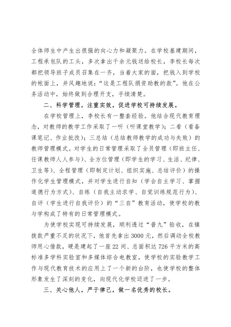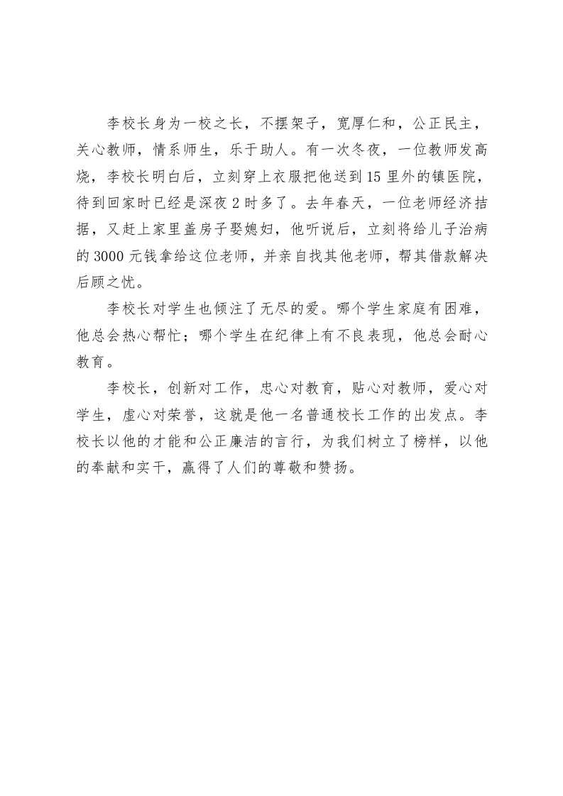 校长事迹创新对工作,忠心对教育,贴心对教师,爱心对学生,虚心对荣誉,这就是他一名普通校长工作的出发点xx,男,党员,中师学历。连续Xx年任xx县Xx镇Xx初中校长,他以“教学思想是办学的灵魂,教育质量是学校的生命,教学管理是办学的关键”为办学理念。多年来,学校被县政府命名为“花园式学校”、市教委命名为“校园建设示范校”、县级“教学管理、教学成绩先进校”,他本人也先后被评为省、市级优秀教师、市“十佳”教师。一、爱岗敬业,无私奉献,做廉洁自律的表率。一个好校长就是一所好学校。一所出色的学校总是跟一个出色的校长联系在一齐。xx初中的师生清楚地记得,xx年11月的一天下午,李校长骑摩托车去镇教育组参加会议,在路上为避让车辆,自我不幸摔倒在地,导致右脚踝受重伤,无法行走。医生整理他在家休息,但他心系工作,心系学生,第二天就来到了学校,手撑着藤椅艰难的登上二楼为学生上课,一向坚持了一个多月,全校师生无不为之感动流泪,都争着抢着搀扶李校长上下楼。为控制学生因贫辍学,李校长组建了“贫困生基金会”,他带头拿出1000元钱,作为基金。在他的带动下,全校师生先后为基金会注入基金达6000余元,解除了贫困生的后顾之忧,使全校的学生巩固率一向持续在98%。李校长无私奉献、勤政廉政、开拓创新的精神和品质,在