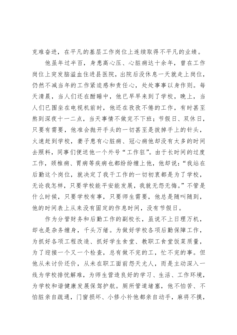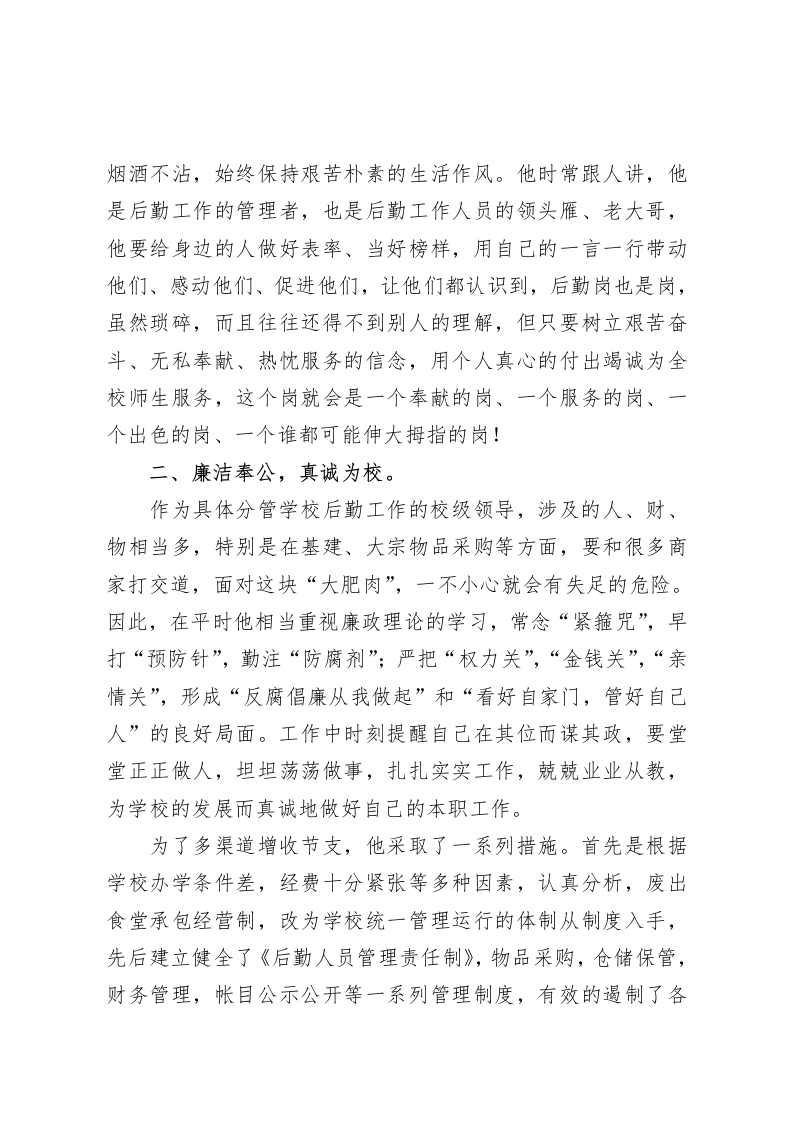 校长事迹分管后勤工作副校长,坚持为教学服务、为教职工服务的方向,团结带领后勤工作人员努力做好后勤服务保障工作xx同志,男,1978年7月参加工作,1976年7月加入中国共产党,XX年8月任xx中学分管后勤工作副校长。花开花谢,春去冬来。不知不觉间,在潘口中学这片热土上,他已辛勤耕耘了几十个年头。“春风得意马蹄疾,老牛拉车路艰辛”,他是后者,肩挑重担,默默前行,追寻着“真诚为校”的不变信念,在艰辛与执著中一路走来。多年来,在校党总支的正确领导和同志们的热情帮助下,他始终坚持“教书育人、管理育人、服务育人”的方针,坚持为教学服务、为教职工服务的方向,团结带领后勤工作人员努力做好后勤服务保障工作,为构建和谐校园做出了不可磨灭的贡献,多次被评为先进工作者、模范党员。他以自己良好的道德品质、高度的敬业精神和热诚的工作态度,多次受到上级主管部门的好评,得到学校师生的充分认可。一、廉洁自律,忘我工作。说xx是一位斗士、一个歌者不为过,因为平凡的他几十年如一日地爱校如爱家、爱岗如爱命、爱生如爱子,这中间虽然有快乐有收获,但更多的是辛酸和付出,多少次面临困境他却不退缩不放弃,始终保持乐观向上的精神状态,硬是凭借他独特的睿智、顽强的毅力、无私的奉献和大胆的创新劈波斩浪、