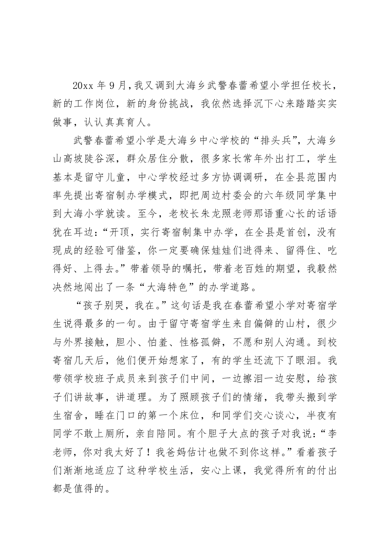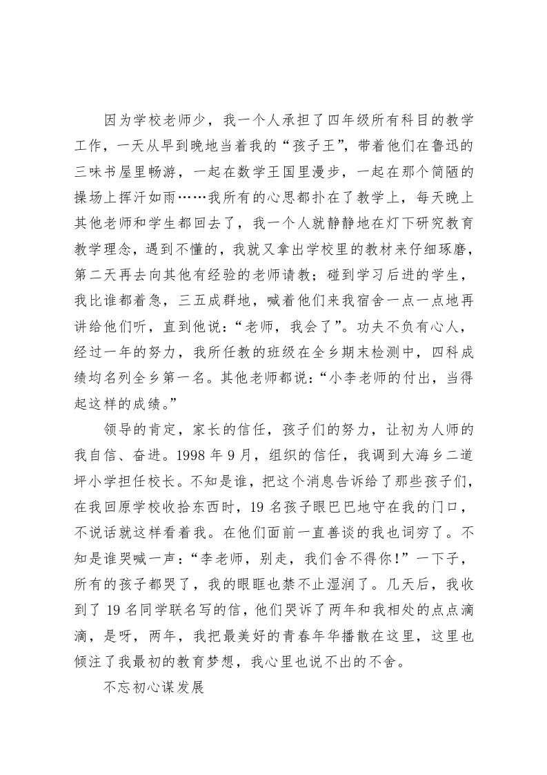 校长事迹生命的意义不在固守,而是开拓燕子去了,有再来的时候;杨柳枯了,有再春的时候;而岁月却是如流水一样,一去不复返。转眼间,我工作已有24个年头,在教育教学的路上,不断演绎着自己的教育教学故事,许多都已随着时日的流逝渐渐淡忘,但有一些如同树根一样深深地扎在了我的心上,历历在目,感人至深。静下心来研教学1996年9月,我从宣威师范毕业,怀揣着满腔热血,打算在自己的职业生涯上一展抱负的我,站在大海乡一个最偏远的小学校一一泥得坪小学的大门口,我所有的激情都没了。看着眼前斑驳的校舍,破败的宿舍,我真恨不得扭头就走。我强迫自己冷静下来,告诉自己凡事都有另一面:兴许因为自己是男孩子,领导要好好磨砺一下自己也说不定,再说了,这儿没什么不好的,可以安安心心地干点自己喜欢的事,挺好的。就这样,我一面收拾东西,一面安慰着自己。有几个小同学刚开始用怯生生的眼光盯着我,后来听别的老师说我是新分来的老师时,他们在那议论开了。有个胆子大一点的小男孩跑过来问我是不是新分来的老师时,看着他那期待的眼神,我情不自禁地摸了摸他的小脑袋:“是的,以后李老师就要和你们在一起学习、生活了,欢不欢迎呀?”小男孩笑了,那一瞬间仿佛定格在了我的脑海里,至今回想起来,都犹如昨天一样。