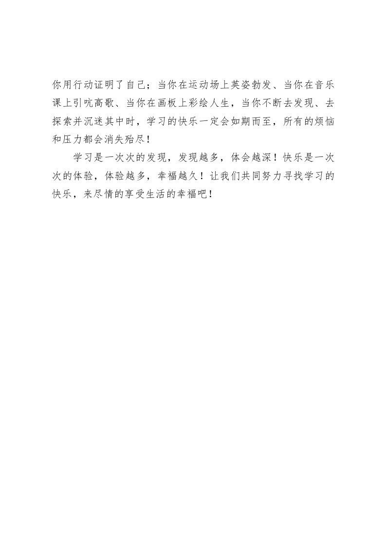 校长在国旗下讲话寻找学习的快乐,享受生活的幸福同学们:学习快乐吗?我想很多学生的回答是“不快乐”,为什么呢?看看我们沉重的书包就有了答案:它里面装满了早起晚睡、作业考试、成绩评比、特招重点等等,所以有人形象的说它是我们身上的负担和包袱,压得我们喘不过气来!果真如此吗?当我们静下心来冷静的想一想,就会得出另外一种答案:沉重的书包是我们人生的智囊、自信的源泉、远大的抱负!我们说学习苦,是因为我们仅仅从生理的角度去衡量它,苦于没有时间看电视、泡网吧、玩游戏、苦于没有时间贪睡、贪吃、贪玩,总之一句话,苦于没有时间贪图享乐!固然,吃喝玩是快乐的,但这种乐趣只是低级的、物质的、短暂的,是动物本能式的快乐,作为人类享受高级的、持久的快乐,应该是精神领域的快乐,她能陶冶情操、让我们自信自强,使我们生活得更幸福!如何获得,只有学习、学习再学习!同学们,知道这个理,我们就要努力的改变观念,寻找学习的快乐,变被动学习为主动学习,坚决不当学习的奴才,要做学习的主人!学习的乐趣是一次次探寻的乐趣,是一个个释疑解惑的乐趣,当你听懂了老师上课所讲述的内容时,你会暗自高兴,因为又学到了自己所不了解的知识;当依靠自己的能力解决了一道道让你绞尽脑汁的题目时,你会油然而生一种成就感,因为