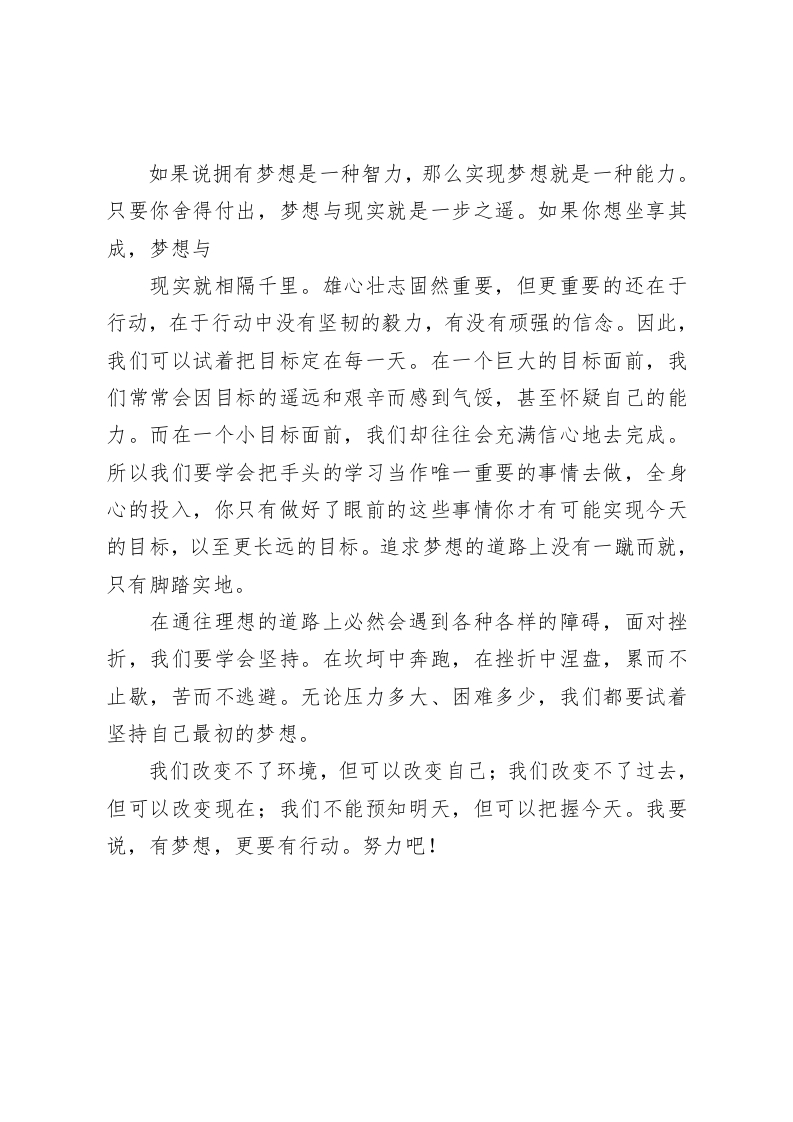 校长在国旗下讲话有梦想,更要有行动尊敬的老师们,同学们:早上好!今天,我演讲的题目是《有梦想,更要有行动》。人不能没有梦想,梦想是美好的,但是如果梦想不付诸现实都只能是一个美好的幻影。梦想的实现需要我们付出很多努力、艰辛。古语云:“天行健,君子以自强不息”,它告诉我们人要有一种积极进取、永不放弃的精神,学习生活中,同学们可能会面临一些如学习竞争、纪律严格、知识水平、能力发展等新问题,会产生一些如生活环境、师生磨合、期望与现实的落差等新的困惑。但是我希望同学们不论遇到多么痛苦的挫折,不论现实和理想有多大的距离,不论梦想的实现有多么艰辛,永远不要放弃,永远不要让父母、师长对你的殷切期望和你自己的美好理想落空。你想成为什么样的学生,你想要什么样的人生,这是每个个体都无法回避的问题,理想和追求决定着我们行动的方向。记住,在这个世界上,你是独一无二的,我们虽然无法复制他人,但是我们可以借鉴。即便是自己存在弱势和不足,也可以试着扬长避短。当然,理想是离不开现实的,如果一意孤行,主观臆测,那只能算作空想。如果你能清醒地认识环境的变化,并且充分利用它所带来的机遇和挑战,那么你的梦想离现实会更近一步。
