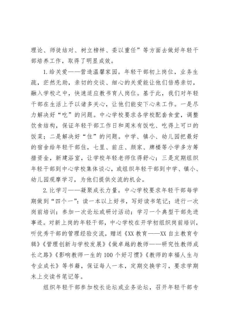校长在全县经验交流会上的讲话如何培养与选拔学校年轻干部尊敬的Xx局,各位领导:大家好!非常荣幸能有这个机会站在这里与各位交流,今天的内容是谈谈在工作中如何有效地培养和选拔学校年轻干部?根据自己的工作经验我认为有以下三点:一、自身成长经历的三点感悟承蒙组织培养,领导栽培,本人自XXXX年担任XX学校校长以来,历经XX、XX、XX、XX、XX五乡镇,虽角色不同,但使命相当。一路走来,风雨兼程;一路走来,开花结果。Xx年,XX学校安全管理经验在全国学校安全管理现场会上作典型交流,由此推介了“XX特色”;Xx-Xx年,我担任XX中学校长,XX中学青年教师人才辈出,有3位老师先后获省优质课一、二等奖,获市优质课一等奖4人次,被XX市xx称之为“XX现象”.xx年调任XX中心学校校长,通过三年不懈努力,xx年中考,XX中学荣获一等奖,赢得XX自建校以来的首次辉煌,创造了“XX奇迹”…这些成绩的取得,得益于对青年教师的培养,得益于广大青年教师团队的奋力拼搏。这些收获,无不印证了三点:一是青年教师敢于创新、初生牛犊勇于挑战;二是学校领导只要敢用善用年轻教师,一定会产生意想不到的效果;三是学校领导只要把年轻教师积极性、主动性和创造热情调动起
