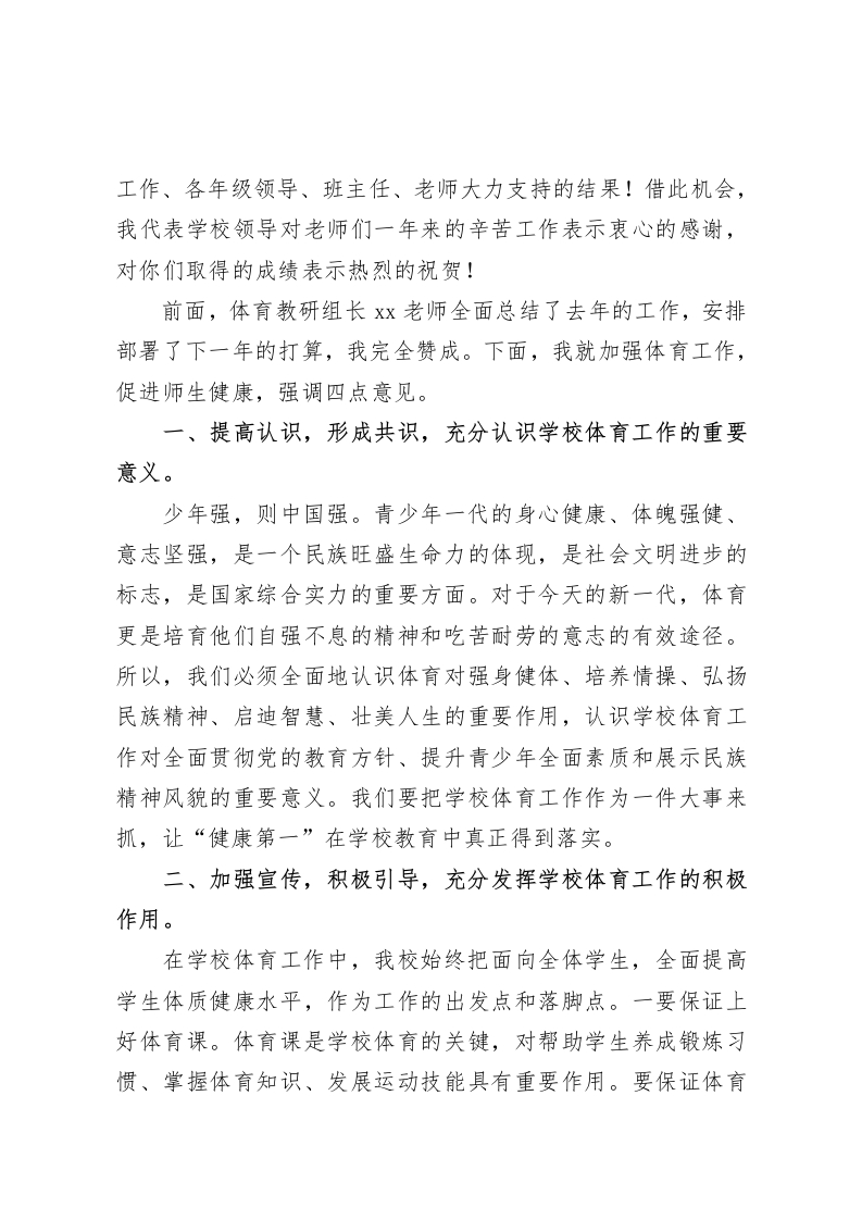 校长在体育工作会议上讲话参加体育锻炼,培养健身意识,崇尚健康第一老师们:多年来,学校始终把体育工作摆在重要位置,充分体现学校“以人为本,和谐发展,让每一位师生都有成功感”的办学理念,认真贯彻落实《学校体育工作条例》,将体育教学、业余训练和群众体育活动有机结合,在提高学生身体素质、培养体育运动人才等方面取得了可喜的成绩,有力推动了我校体育工作向前发展。回顾过去的一年,我校体育工作取得了显著成绩,一是成功承办了Xx首届“匹克杯”中小学生男子篮球赛,实现了“安全、规范、公正、节俭”的目标。在区教育局领导下,我校精心组织,积极行动,密切配合,取得了运动成绩和精神文明双丰收。二是群众体育蓬勃发展。工会每月一次的“月月健身赛”活动,参与老师越来越多,老师们健身意识普遍增强,健身行动积极踊跃。三是竞技体育扎实推进。4月,我校四名学生代表xx参加市运会,取得了3金、4铜的好成绩;10月,在区首届“匹克杯”中小学生男子篮球赛中,我校运动员精诚团结,奋力拼搏,勇夺第一;11月,在区第十二届中小学生田径运动会上,我校分别夺得男子团体第一名,女子团体第三名的优异成绩。这些成绩的取得是学校高度重视的结果,是体育老师辛勤