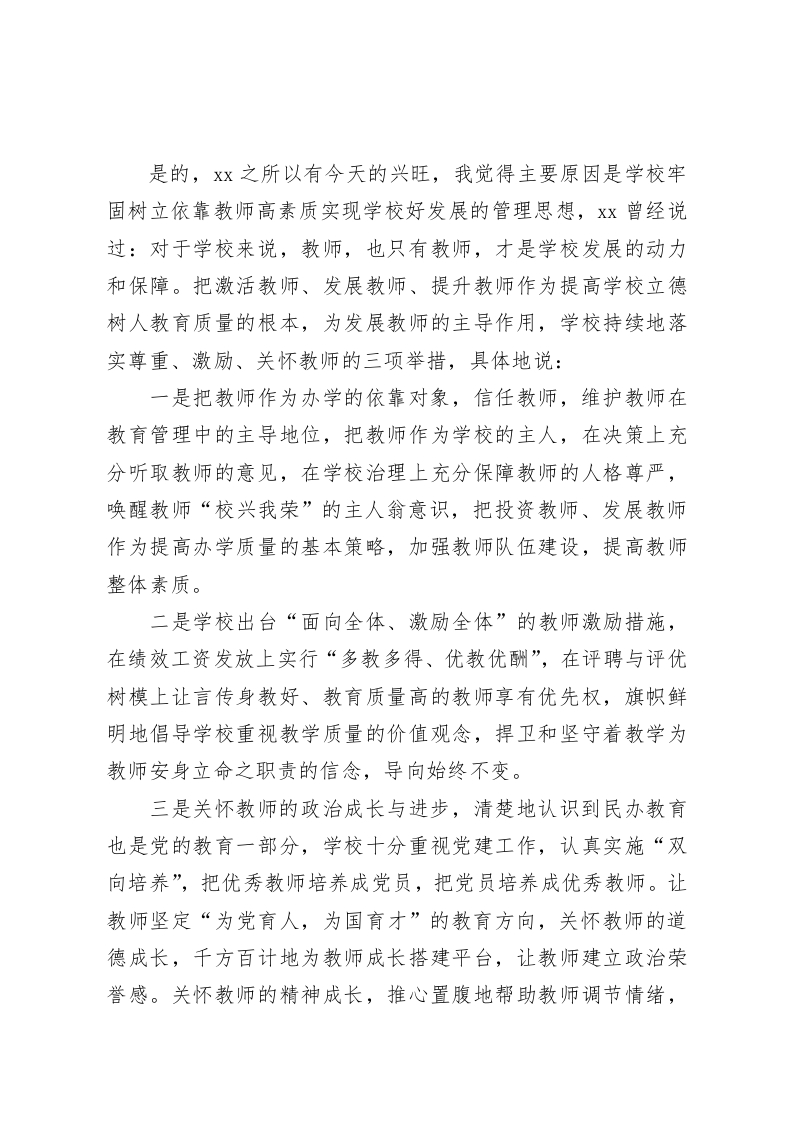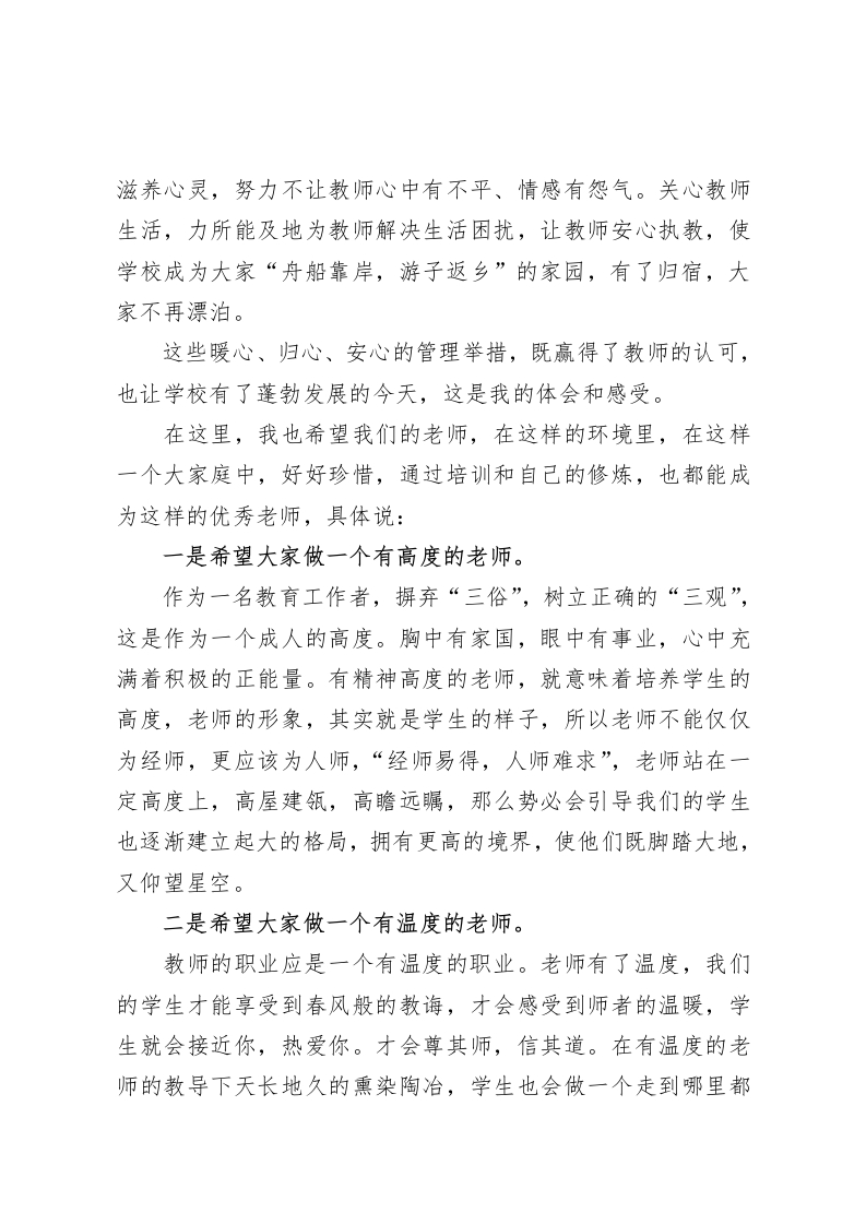 校长在校本培训会上讲话晴空中的一丝丝阴云,这就要靠我们自己去净化尊敬的各位领导,各位老师:大家上午好!今天很高兴,又和大家见面了。20XX年X月,我走进了Xx校园,虽然已过去了十几年时光,但仍心系xx。xx在“在中国办一所好学校”的目标引领下,在xx人的共同努力下,已经逐渐走向了成功,我也成为目睹了Xx发展的经历者、成功的点赞者、荣光的分享者。前不久,我在朋友圈里看到了我们的一位老师写的一篇文章,他在这篇文章里表达了在xx这个大家里的工作、生活的真实感受。标题是“温情、真情、深情一一骨子里的xx”,并在文中写道:“这是我认识的骨子里的xx,温情、真情、深情,这是一所高中的情怀”,看后我很感动,随即在评论栏写了一首七言打油诗,以表达我的读后感想:温情育人沐春风,抚润感化不言中。真情唤醒奋进者,名师引领攀上峰。深情回望成长路,谢恩团队互助功。xx文化入骨里,尊师重教氛围浓。