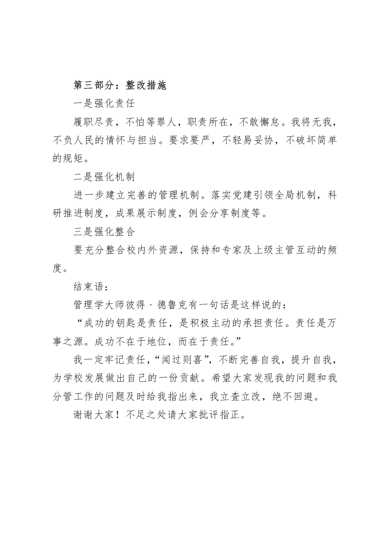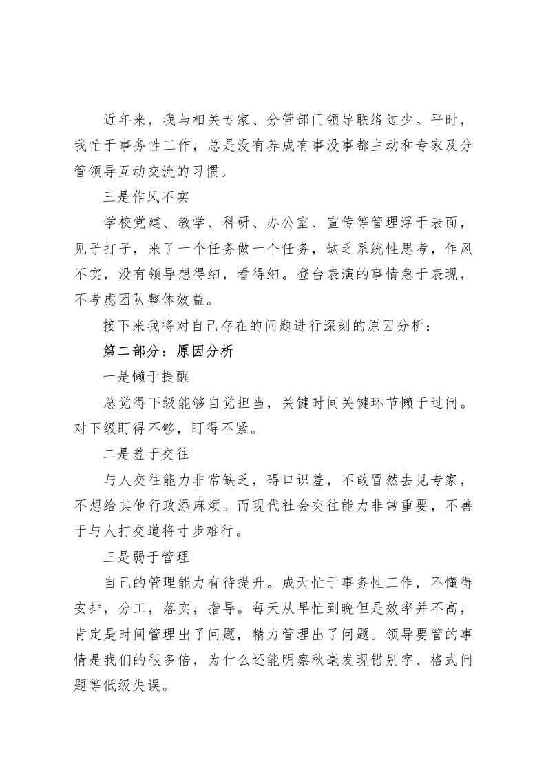 校长在行政班子会上做了反思性发言,非常深刻,包含主要问题,原因分析,整改措施3个方面的讲话,逻辑清晰各位领导,各位同事“反思是进步之梯”,我们要善于在问题中寻求突破,获得自我能力的增长。为了推进学校工作,提升自己的管理能力,今天我对自己分管的工作做出深刻反思。反思是一种自我剖析,反思是一种理性思考,希望我的自我工作检讨能够对大家产生引以为戒的作用,大家一起齐心协力推动学校向更好方向发展。我的发言分为三个部分,下面我逐一汇报:第一部分:主要问题回顾一学期来自己在学校分管的工作,出现了三个具体问题:一是德育活动的策划工作出现时间延迟,优秀少先队员评优迟迟没有推进,我竟然无感:二是教学展示活动教师试讲次数不够,发挥不好,影响了学校声誉;三是学校科研工作例会没有做到分工明确,当然这些问题也是累积而成的。反映了我在集团层面管理中的三大问题:一是管理不严管理工作中有时候充当烂好人,不想给别人添麻烦,反而降低了管理的工作标高。二是互动不够