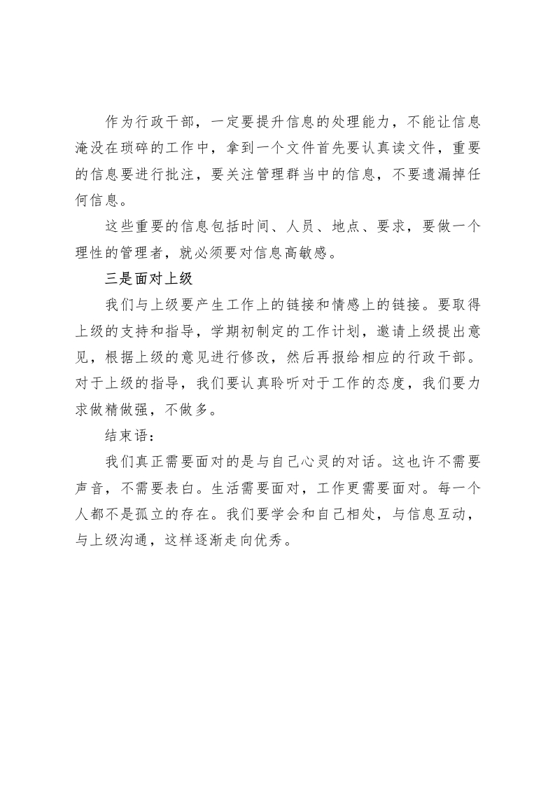 校长在行政会上讲话要学会和自己相处,与信息互动,与上级沟通各位行政:莎士比亚的《裘里斯凯撒》,其中有一句台词让我印象深刻。这句台词是:“懦夫在未死以前就已经死了好多次,勇士一生只死一次。”梭罗也在他的文章当中写出过这样一句话:“大多数人都生活在平静的绝望中。”作为系统人,作为管理者,我们要面对很多很多的问题、麻烦、矛盾和困扰,如何来面对呢?西塞罗说:“活着就是为了思考。”我希望大家带着思考来面对工作。今天的行政会,我重点分享三个“面对”:一是面对情绪“作为一个领导人,应该控制自己的情绪,很多时候发脾气是无能的表现,合理的情绪控制对于团队的和谐,稳定军心有大作用。”作为团队管理者,我们要善于安抚情绪,并且要学会戒掉情绪,需要戒掉的是负面情绪。我们要学会自我安抚,不在情绪上浪费时间,要善于观察教师的情绪变化。面对情绪,我们只能做情绪的主人,而不能做情绪的奴隶。在职场上,只有集中精力把事做好才能取得成功。如果把时间都耗费在情绪上,对个人成长和团队发展都是没有价值和意义的。二是面对信息