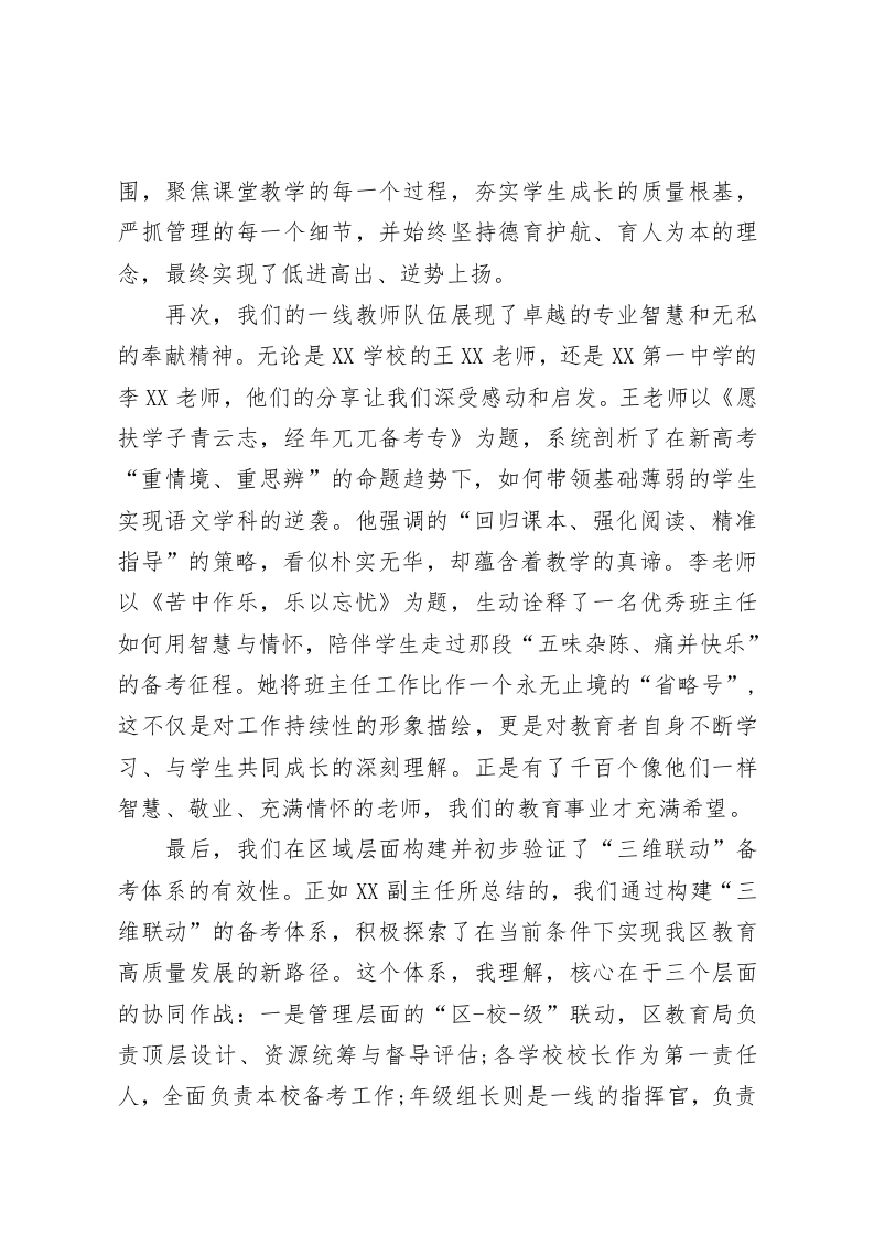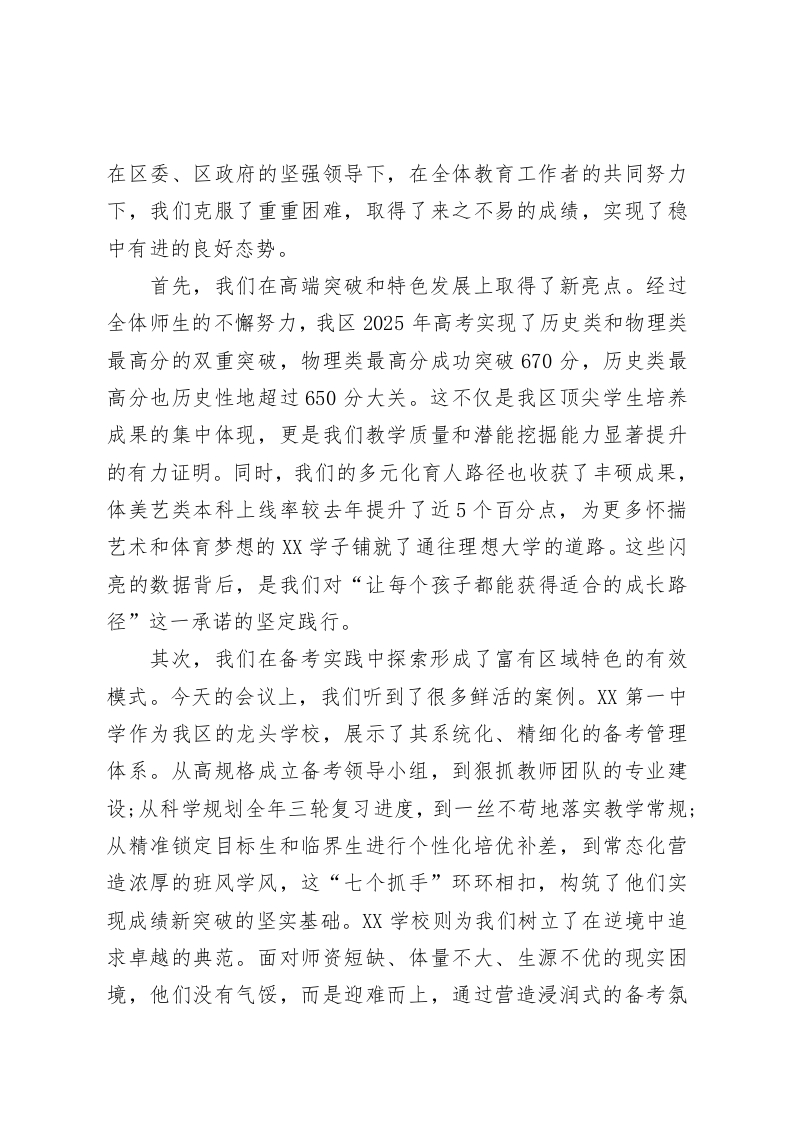在XX区2025年高考总结暨2026年高考备考座谈会上的讲话(精品)各位同志、各位校长、老师们:大家上午好。今天,我们怀着总结经验、共谋未来的共同心愿,在这里召开XX区2025年高考总结暨2026年高考备考座谈会。刚才,XX第一中学和XX学校的负责同志,以及两位奋战在一线的教师代表X老师、XX老师,都从不同层面、不同角度分享了宝贵的备考经验和深刻的教学感悟,讲得非常实在,也很有启发。XX副主任全面总结分析了我区2025年的高考情况,XX主任也对下阶段工作提出了明确的期望和要求。他们的发言,为我们接下来的工作提供了清晰的镜鉴和有力的抓手。借此机会,我代表区教育局,向在2025年高考备考工作中辛勤付出的全体高三师生、向关心支持我区教育事业的各位同仁,表示衷心的感谢和崇高的敬意!今天我的讲话,主要围绕三个方面展开:一是回顾过去,我们取得了哪些成绩,积累了哪些经验;二是剖析现状,我们面临哪些挑战,存在哪些短板;三是展望未来,我们应该如何部署,怎样才能打赢2026年的高考攻坚战。一、肯定成绩,正视差距,深刻总结2025年高考备考经验回首刚刚过去的2025年高考,我们是在生源基础相对薄弱、竞争压力空前激烈的大背景下,砥砺前行、奋力拼搏的一年。