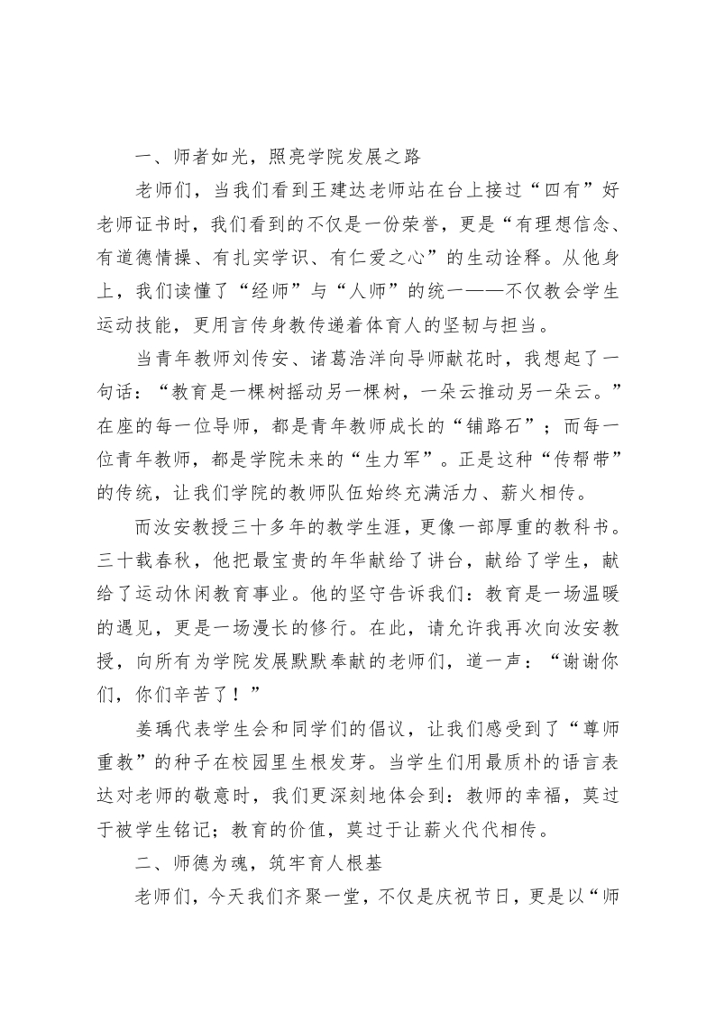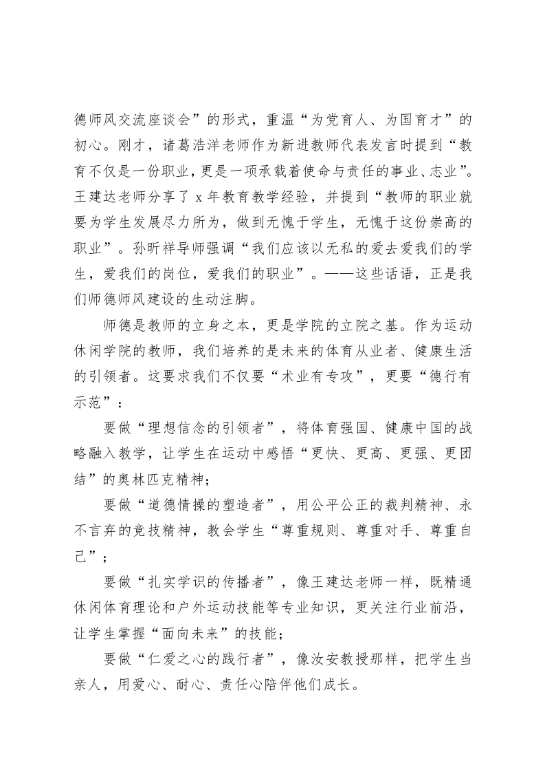 在师德师风交流座谈会上的讲话材料汇编(4篇)目录1.在师德师风交流座谈会上的讲话2.在师德师风培训会上的发言3.党委书记在师德建设主题教育月动员大会上的主题讲话4.在师德师风建设专题学习动员会上的讲话在师德师风交流座谈会上的讲话1尊敬各位老师,亲爱的同学们:大家上午好!今天,我们相聚在xxxx教室,共同庆祝第Xx个教师节,同时召开师德师风交流座谈会。刚才,我们一同见证了王建达老师荣获“四有”好老师的荣光,见证了青年教师向导师献花的感动,见证了汝安教授三十年教龄的坚守,更聆听了姜璃代表同学们发出的“尊师重教”倡议。每一个环节都让我心潮澎湃一一这不仅是一场仪式,更是一次精神的传承、情感的共鸣,是属于我们运动休闲学院全体师生的“教育初心礼赞”。在此,我谨代表学院党政领导班子,向辛勤耕耘在教学、管理一线的全体教师致以节日的问候!向今天受到表彰的各位老师、即将接过育人接力棒的青年导师们,致以最崇高的敬意!今天我想和大家分享三点: