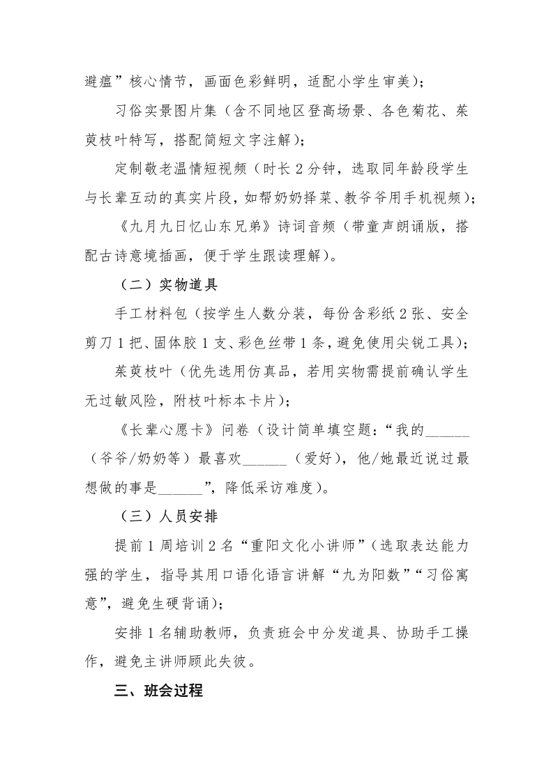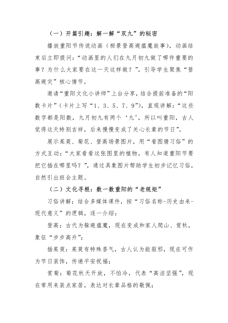 一寸秋光暖重阳,一生孝心伴成长—2025年重阳节主题班会一、班会信息班会主题:传承重阳文化,践行敬老孝心适用年级:小学3-6年级班会时长:40分钟班会目标:1.清晰了解重阳节“桓景避瘟”的起源传说,掌握“九为阳数、双九相重”的文化内涵,能准确说出登高、赏菊、插茱萸、饮菊花酒4项核心习俗及寓意,明确其从“避灾祈福”到“敬老感恩”的现代意义转变。2.通过真实案例与互动,激发对中华传统节日的认同感与热爱,破除“孝心是成年人责任”的认知误区,建立“关爱长辈不分年龄”的观念,培养主动感恩长辈的真挚情感。3.学会3-5种日常敬老的具体方法(如生活照料、情感陪伴),独立制定可落地的“个人孝亲行动计划”,将敬老意识转化为每周可执行的实际行动。二、班会准备(一)多媒体素材重阳节传说动画(时长3分钟,突出“桓景拜师、登高