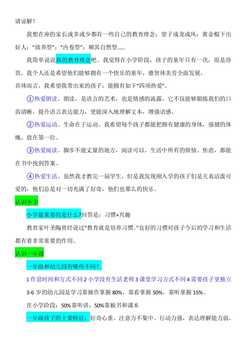 【一上】【英语】【童心筑梦教育至美】开学家长会-发言稿目录:01班级情况介绍02英语学习方法03在家怎么读英语04家长可以做什么班级情况介绍认识一()班我们是46名宝贝组成的新生大家庭,男生23人,女生23人年级开设的课程有语文、数学、音乐、体育、美术、道德与法治、书法、阅读认识各科老师:介绍下各科老师及联系方式认识班主任我叫,是我们一()班老师,从事教师职业己经有x年,有着丰富的教学经验。接下来的6年,我会尽己所能,陪伴孩子们成长。用心浇灌,陪伴他们从一棵幼苗,成长为挺立的小树;从牙牙学语的稚童,成长为x学校的大美少年!欢迎联系班主任xx老师的手机号:1300000000班级QQ群:12345678(QQ群要求:作业及学校通知会在QQ发布,请家长添加后自动更改群名称为:XX+家长,本群只谈教育,只谈孩子,其他言论一律不在群里发。个别学生的事情请和老师个别交流。)上课和管班时间我身边不带手机(孩子们在校的照片不会像在幼儿园一样经常发),如果有急事又打不通电话请发短信,我在空课时回复。晚上9点以后,电话静音,敬