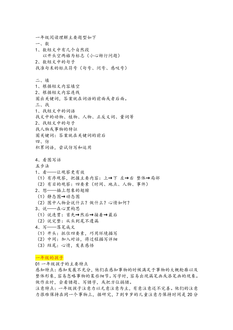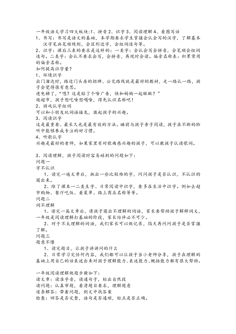 一年级家长会发言稿目录、封面页各位家长好!我是101班的班主任兼语文老师,非常感谢大家能够来参加本次家长会,也非常感谢你们对学校工作和我教学工作的理解与支持。如果没有各位家长的倾力配合,家校共育是无法实现的,今天我们聚在这里是为了我们的孩子能够更好的发展,对于家长来说,这是一次宝贵的机会:能够了解孩子的在校情况和表现,学到一些育儿方法:对于我们老师来说,也是一次难能可贵的机会:可以和家长面对面地交流,能够更地深入了解每一个孩子。时间宝贵,机会难得。那废话就不多说,我们直接进入正题。本次家长会分为五个部分:关于咱们班、聊聊一年级语文学科的学习方法、认识一年级的孩子、家校教育和安全教育。走进咱们班咱们班总共有45名孩子,其中包括20名女生和25名男生。由于咱们班男生数量较多,比例较大,班级整体的表现是比较活泼好动的,孩子之间的小摩擦是无法避免的,但好在孩子们都能够意识到团结友爱的重要性,有矛盾能够理性地处理,家长们也能够帮助我正确引导孩子,在这里我要再次感谢各位家长。女生相比于男生是文气的,学习和生活上都比较乖巧。接下来是咱们班老师的联系方式,大家有需要可以留存,有问题能够及时沟通,不过尽量选择在工作日上班时间联系沟通哦。这是我和同学们共同树立约定的班级目标,我们不仅在学习方面要“上好课”“读好书”“写好字”,在其他方面也要全面发展,现在看来咱们班的孩子都能够做到在大课间“做好操”,在美术课“画好画”,在音乐课“唱好歌”,同学们都为了成为一个“好的人”在努力,我感到特别开心。接着是我们学校的作息表,请留存,特别注意上下学时间。学习方法01预习与复习要求预习1、读:大声朗读课文3-5遍,读准字音,读通句子。2、标:标出自然段序号3、圈:圈出一类字(会写的字)和二类字(会认的字)4、画:用直尺画出一类字和二类字在课文中组成的词语(没有词语可不画,只圈画出生字即可)5、书:看着书本书空田字格里的生字笔顺6、说:一类字二类字每个字口头组词2个7、想:思考课后题复习1、课文大声读3遍,争取背诵。2、指读会认字,书空会写字3、回答课后问题02认识一年级