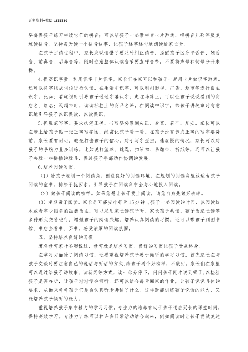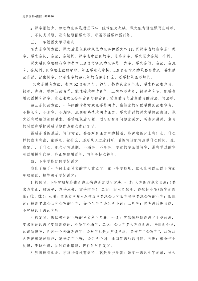 更多资料+微信t839886202x秋一年级期中家长会发言稿各位家长:大家好!十分感谢大家能配合学校的工作,准时来参加这次的期中家长会。我是一(1)班的的语文老师兼班主任林老师。召开这次家长会的目的是为了加强老师与家长之间的联系,以便我们能够及时调整工作,提高教育教学质量,同时促使家长也能够积极参与到孩子的教育管理中来。此次家长会主要从班级总体情况、期中练习分析、语文学习重点等七大方面来展开交流:一、班级总体情况先说说学生进步的方面:在这半个学期里,同学们在课堂表现方面取得了不小的进步。很多同学能够做到认真听讲、积极思考、乐于回答问题,学习热情和参与度较高。在作业方面,大部分同学能够按时完成作业,并表现出一定的独立性和自主性。一些同学作业完成质量较高,不仅字迹工整,而且思路清晰。在行为习惯上,大部分同学能够养成讲卫生、爱整洁的好习惯,课间能自觉遵守纪律,如不追逐打闹、不大声喧哗等。一些同学在待人接物方面也表现得很有礼貌,主动和老师、同学打招呼,懂得尊重他人、关心他人。除了学科学习,学校还组织了一年级课堂常规展示活动。在活动中,同学们积极参与,展现出了良好的课堂学习习惯和团结向上的集体精神风貌。这些进步方面值得肯定和表扬,希望孩子们能再接再厉。但在班级管理中,老师也发现了同学们存在的一些问题:1.个别同学卫生习惯较差,有乱丢垃圾、课桌凌乱、不及时清理自己座位的现象。2.部分同学早上上学时间观念不强,有迟到现象。3.不能妥善保管自己的物品,每节课后都有学生检到铅笔橡皮,问后还无人认领。4.少数同学上课不够认真,做小动作,影响听课效率。这些个别孩子存在的问题老师会引导教育,也会单独和家长反映沟通,家校共同配合,有针对性地帮助孩子努力改进。二、期中练习分析成绩除了与孩子自身的努力有关外,和各位家长对孩子的认真辅导也是分不开的。这次期中练习反映出学生在以下方面还需努力:1.拼音知识掌握不熟练。分不清前鼻韵母与后鼻韵母、平舌音与翘舌音的读法、写法;没记住j、q、x、y和ⅱ相拼要去掉两点的规则;不会看拼音写词语等。