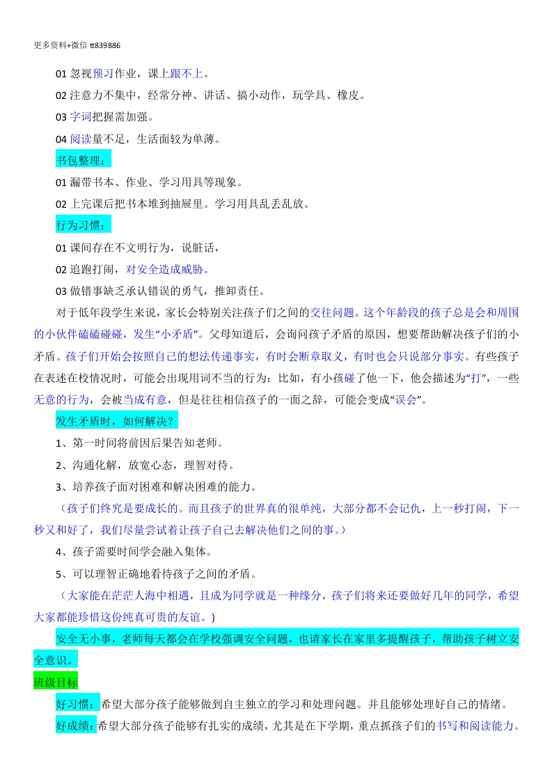 更多资料+微信t839886【二下】【语文】【护航成长,共筑未来】期末家长会发言稿前言:这一学期,孩子们在学校中经历了许多挑战与机遇,他们不仅学习了新知识,还在各种活动中锻炼了自己的能力。我们深知,孩子们的成长离不开家长的陪伴与引导,也离不开学校的教育与培养。因此,我们希望通过这次家长会,与家长共同回顾孩子们的成长历程,分享他们的进步与收获。我们要共同为孩子们的成长保驾护航,确保他们在学习和生活中都能得到全面的关注和支持。我们共同的愿景,即为孩子们打造一个更加美好的未来。再次感谢各位家长对学校工作的支持与配合。让我们携手并进,为孩子们的成长保驾护航,共筑他们的美好未来!目录:01回首二年级02展望三年级03充实过暑假04安全不放假一、回首二年级班级基本情况本学期我们班级是一个有着45名同学的温暖大家庭,其中女同学23名,男同学22名。本学期班级干部是按照轮流实行制度,几乎每一位同学都担任过班长、学习委员、体育委员、卫生委员、纪律委员和小组长等职位,每一位同学都做的很好。孩子的成长01作业有进步:大部分学生能按时完成,并且在正确率、书写速度方面也进步了。02听课习惯和课堂纪律明显有了改观。03卫生观念强了,动手劳动的能力也增强了。04集体观念强了:同学之间能做到团结互助,已经有了为集体着想的意识。05更加讲文明懂礼貌:比如借阅书籍时能够排队礼让。表扬我们的孩子光荣榜:特别祝贺以下同学学习之星:×××、×××阅读之星:×××、×××.…些问题学习: