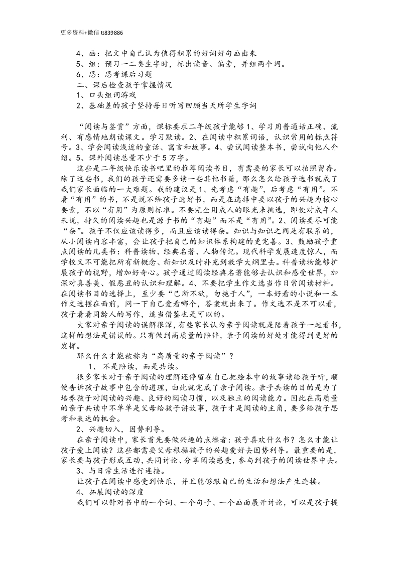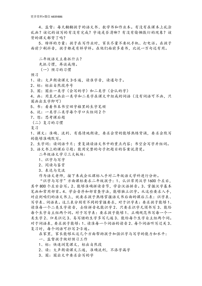 更多资料+微信t839886二下家长会发言稿封面、目录页(P1-2)各位家长好!我是201班的班主任兼语文老师,非常感谢大家能够来参加本次家长会,也非常感谢你们对学校工作和我教学工作的理解与支持。如果没有各位家长的倾力配合,家校共育是无法实现的,今天我们聚在这里是为了我们的孩子能够更好的发展,对于家长来说,这是一次宝贵的机会:能够了解孩子的在校情况和表现,学到一些育儿方法:对于我们老师来说,也是一次难能可贵的机会:可以和家长面对面地交流,能够更地深入了解每一个孩子。时间宝贵,机会难得。那废话就不多说,我们直接进入正题。本次家长会分为五个部分:班级现况、学习建议、科学认识、家校共育、和安全教育。班级现况(P3-9)咱们班总共有45名孩子,其中包括20名女生和25名男生。经过一段时间的相处,我发现咱们班的孩子大多数都是健康活泼、朝气蓬勃的。但是由于咱们班男生数量较多,比例较大,班级整体的表现是比较活泼好动的,孩子之间的小摩擦是无法避免的,但好在孩子们都能够意识到团结友爱的重要性,有矛盾能够理性地处理,家长们也能够帮助我正确引导孩子,在这里我要再次感谢各位家长。女生相比于男生是文气的,学习和生活上都比较乖巧。接下来是咱们班老师的联系方式,大家有需要可以留存,有问题能够及时沟通,不过尽量选择在工作日上班时间联系沟通哦。这是我和同学们共同树立约定的班级目标:上课要做勤思鸟,下课要做小绵羊,作业要做小骆驼,排队要做南飞雁,劳动要做小蜜蜂。接着是我们学校的作息表,请留存,特别注意上下学时间。本学期我们组织了许多精彩的活动,春游、运动会、跳蚤市场、读书角、游园活动等等。这些活动不仅丰富了孩子的校园生活,同时也锻炼了孩子的实践能力。开学到现在以来有部分孩子表现的特别优秀,首先这些同学是上课认真、积极举手的表达之星:…以下同学是作业优秀、字迹清晰的书写之星:…以下同学是热心班级、乐于助人的小雷锋:…以下同学是自觉守纪的自律之星:…学习建议(P10-30)一二年级的优秀孩子是“陪”出来的。一年级是适应和熟悉的过程,而二年级是巩固的阶段,要养成自觉性,有计划地学习,培养良好的学习习惯。二年级是关键时期,在这个阶段,父母的付出和孩子的收获有较大的关系。怎么“陪”孩子学习?1、营造好的学习氛围:固定的学习桌,尽量营造一个安静、不被打扰的环境。学习桌面一定要整洁,桌面乱七八糟,各种作业本堆在一起,是很难集中注意力写作业的。提前准备好学习用品,不要写到一半临时四处找。2、固定的时间:立好规矩放学回家简单休息后,优先完成家庭作业。未完成前其他一切娱乐活动免谈。3、辅导作业:一年级孩子的识字量和理解能力都还没跟上,很多题目他们是读不懂的,家长需要在旁边适时引导。