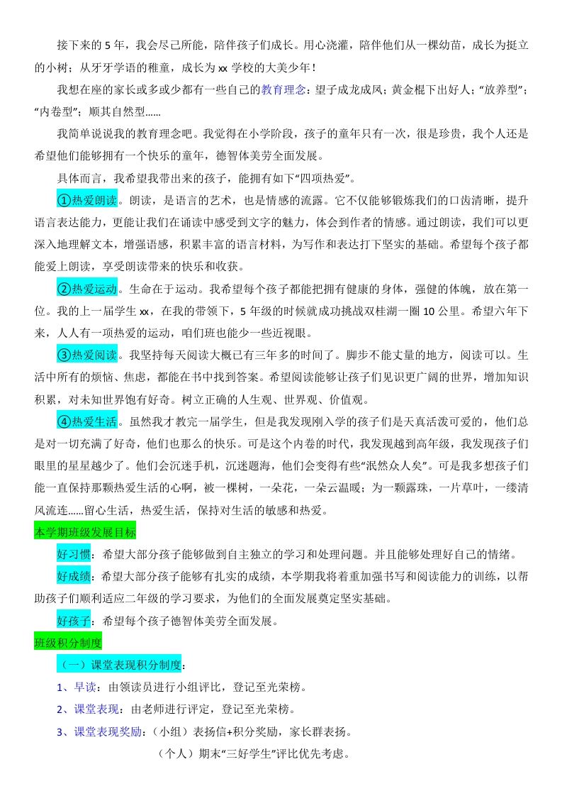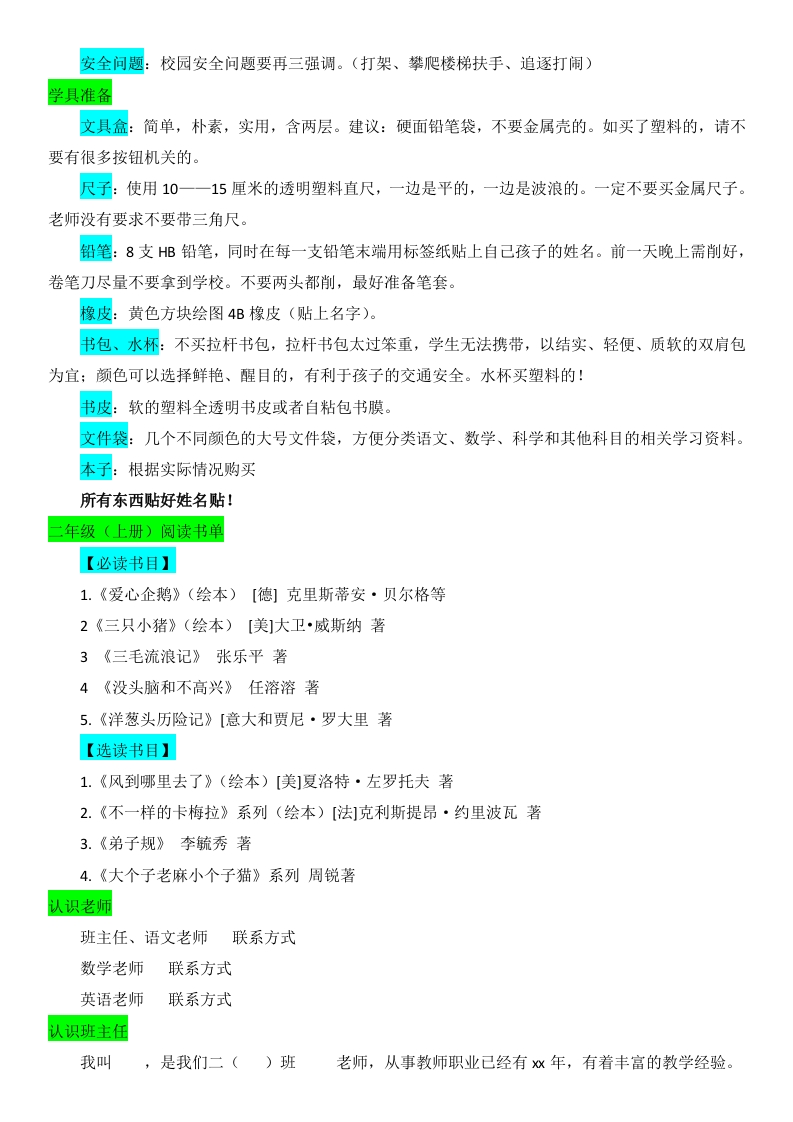 【二上】【语文】【做孩子成长的合伙人】开学家长会-发言稿前言:苏霍姆林斯基曾说过:“教育的效果取决于学校家庭的一致性,如果没有这种一致性,学校的教学、教育就会像纸做的房子一样倒塌下来。我们相信,只有家长、学校、社会三方共同关注,才能真正推动教育的进步,帮助孩子们更好地成长。让我们携手并进,以关注为动力,共同为孩子们的未来添砖加瓦,让教育真正成为他们翱翔蓝天的翅膀。现在,让我们携手,共同迈进新学期,做孩子成长路上最亲密的合伙人!目录:1开学篇:暑假收心总结2学科篇:不一样的二年级3成长篇:二年级,怎样做?4家校篇:做孩子成长的合伙人“、暑假收心总结暑假优秀作业展示家长如何帮助孩子收心?(总结、调整、谈心、计划和准备)首先,孩子在暑假生活和学习状况和孩子们进行总结。然后,调整好孩子的作息时间和饮食生活习惯。接着,和孩子谈谈心,了解孩子对新学期的打算。最后,制定新学期计划和准备好学具。让孩子尽快转换角色,从暑假收心,适应学校生活。本学期的期待成长轨迹:期待孩子们的成长过分贪玩:少数学生还没有摆正学习的位置,贪玩,和同学只想着玩游戏而浪费时间造成无心学习。学习习惯不好:部分学生的学习习惯和方法比较落后,效率较低,书写潦草。学习缺乏主动性:部分学生学习目的不够明确,学习态度不够端正,缺乏主动性。自觉性差:个别学生的学习自觉性较差,做什么事都要老师或家长看着。卫生习惯:习惯卫生有待加强。个别同学抽屉垃圾不及时清理。整理书包的习惯:学习用品整理习惯:铅笔橡皮要备齐、书本、作业不能忘记。值日问题:值日生打扫速度慢、拖拉。