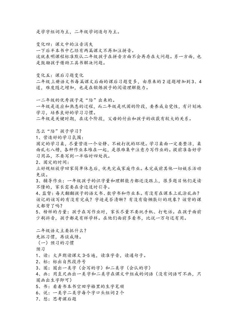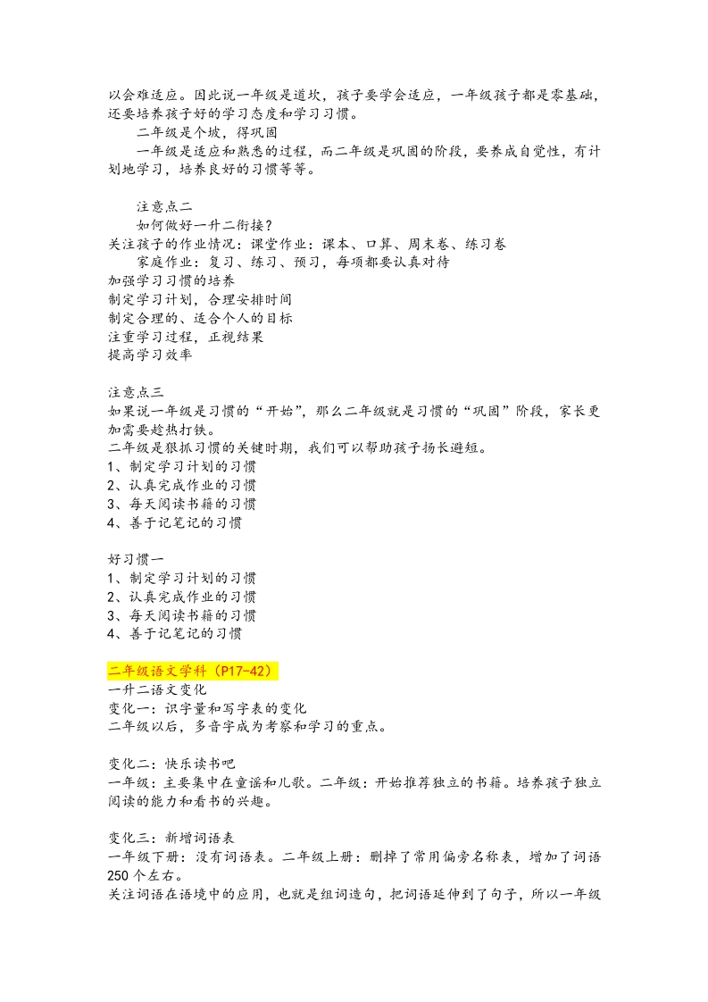 二上家长会发言稿目录、封面页(P1-2)各位家长好!我是201班的班主任兼语文老师,非常感谢大家能够来参加本次家长会,也非常感谢你们对学校工作和我教学工作的理解与支持。如果没有各位家长的倾力配合,家校共育是无法实现的,今天我们聚在这里是为了我们的孩子能够更好的发展,对于家长来说,这是一次宝贵的机会:能够了解孩子的在校情况和表现,学到一些育儿方法:对于我们老师来说,也是一次难能可贵的机会:可以和家长面对面地交流,能够更地深入了解每一个孩子。时间宝贵,机会难得。那废话就不多说,我们直接进入正题。本次家长会分为六个部分:班级概况、关于一升二、二年级语文学科、二年级孩子特点、家庭教育建议、安全教育。班级概况(P3-8)我们的老师班主任兼语文老师陈小美老师联系电话:136xxx×X×x×从事语文教学以及班主任工作已经六年多,经验丰富。遵守工作纪律,团结同事,热心帮助同事:教育目的明确,态度端正,钻研业务,工作踏实,关爱学生,有奉献精神。先后多次获得“优秀班主任”“教学能手”“优质课一等奖”等荣誉。数学老师张小玮老师联系电话:138xxx×xxx×从事数学教学已经六年多,经验丰富。遵守工作纪律,团结同事,热心帮助同事;教育目的明确,态度端正,钻研业务,工作踏实,关爱学生,有奉献精神。先后多次获得“教学能手”“优质课一等奖”等荣誉。我们的班级咱们班共有45名孩子,其中女生20名,男生25名。孩子们健康活泼,朝气蓬勃。女生大多乖巧文静,经过一段时间相处,都互相熟悉,结交到了好朋友,建立了宝贵的友谊。男生占比较多,整体较为好动活泼,多数开朗外向,但也比较粗枝大叶,同学间整体田结友爱。班级目标上好课、画好画、做好操、唱好歌、做好人、读好书、排好队、写好字课程安排&作息表如下关于“一升二”(P9-16)注意点一为什么说一年级是道坎,二年级是个坡?一二年级是关键时期,在这个阶段,父母的付出和孩子的收获有比较大的关系。一年级是道“坎”,要学会适应对于幼儿园刚毕业的孩子来说,一年级的一切都是全新的,因为不习惯,所