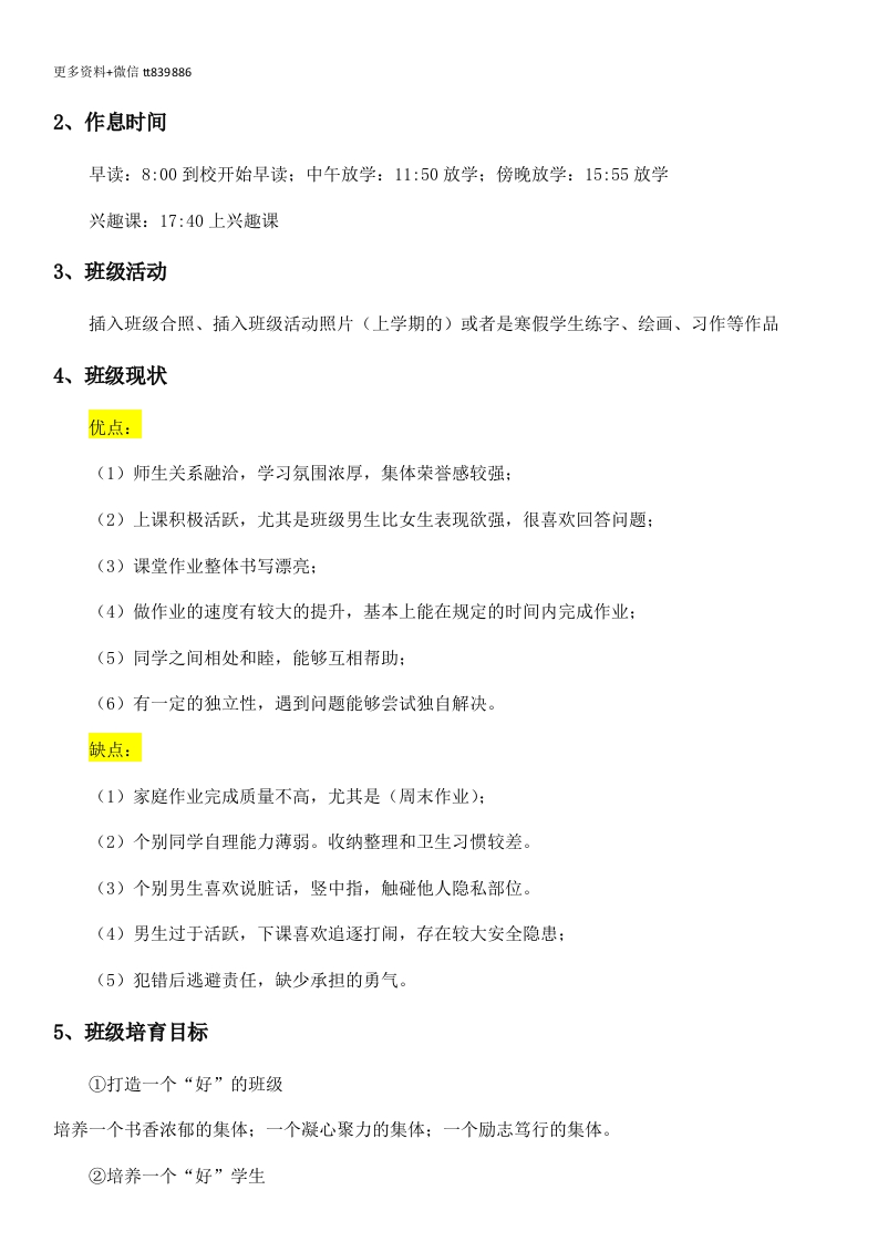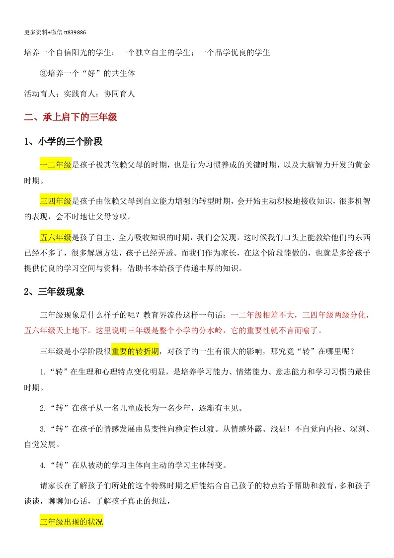 更多资料+微信t839886与孩子同行,共话成长路同/心/同/行/家/校/协/力/共/育/未/来三2班家长会前言、目录欢迎家长莅临若只有学校而没有家庭。或只有家庭而没有学校。都不能单独地承担起,塑造人的细致、复杂的任务。苏霍姆林斯基会前的温馨提示:在家长会开始之前,悬请各位家长做到以下几点,由此给各位家长带来的不便,敬请谅解。请把手机置于静音或关机状态请各位家长不要在室内空间吸烟请各位家长保持安静不要高声谈论请各位家长不要随意走动本次家长会分为4个板块进行:多姿多彩的班集体:承上启下的三年级:厚积薄发的语文学习:至关重要的家庭教育。一、多姿多彩的班集体1、我们的班级我们班女生22人,男生23人,一共45人,学生多数非常懂事、听话。班内同学团结友爱,互帮互助,形成了良好的班风。学生学习多数比较认真、努力,形成了良好的学风。我们是阳光中队,阳光中队是由45个小太阳组成的大集体。我们活泼热情,犹如45轮初升的太阳。我们奋发、团结、向上,我们努力、奋斗、拼搏。45个发光的小太阳团结进取,发出光和热,温暖你,温暖我,希望成为热爱生活、充满朝气的阳光男孩、阳光女孩。我们的目标是:团结友爱、奋发向上、勤劳活泼、健康成长。我们的口号是:阳光、自信、顽强、向上。我们的班训是:团绪拼搏,乐学善思