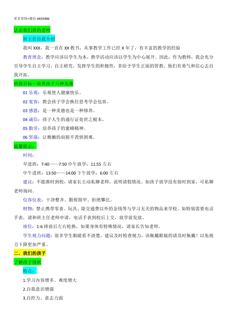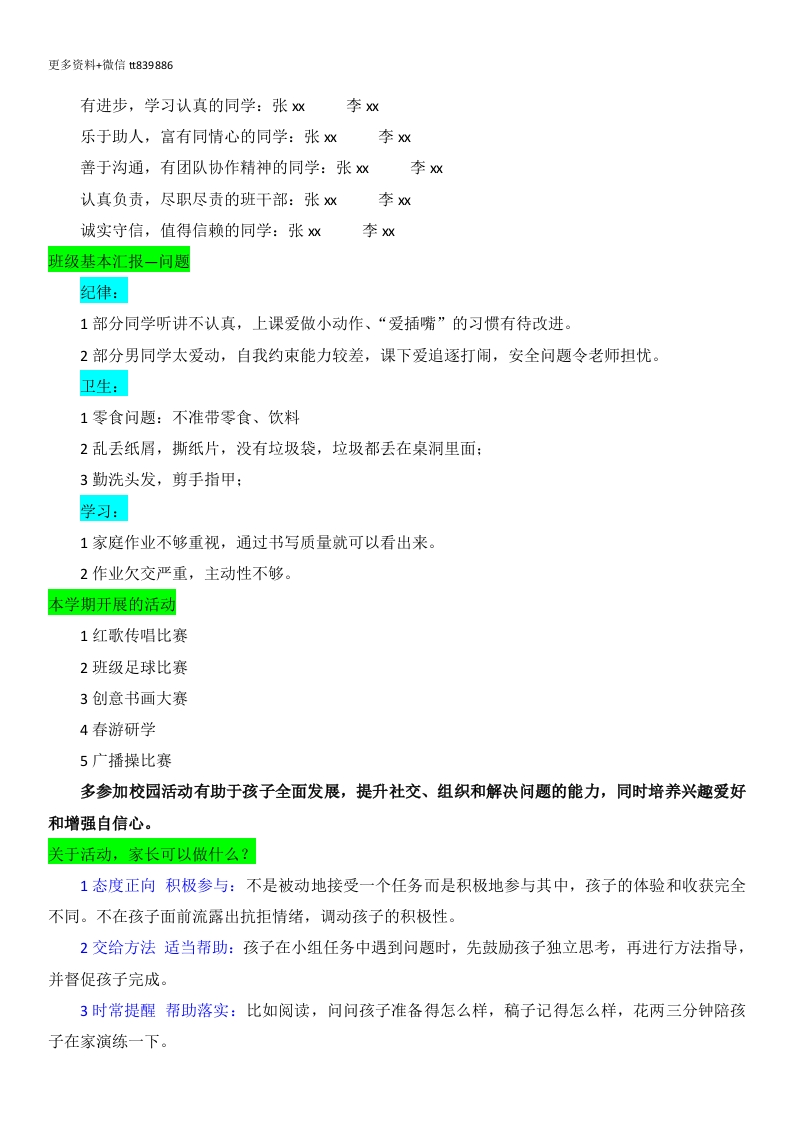 更多资料+微信t839886【三下】【语文】【为了孩子齐用心】期末家长会发言稿目录:01我们的班级02我们的孩子03三升四语文04为了孩子齐用心我们的班级班级情况汇报怎样了解孩子在学校的学习状态?"三看”1.从各科作业上看。(翻开孩子的练习本、课本,亲自走进孩子的点滴生活中)2.从做题规范上看。(学生应认真审题,确保答案与题目要求相匹配:同时,注意书写规范,保持卷面整洁,以提高答题质量和得分率。)3.从单元小测成绩看。(最为客观,及时查漏补缺)比你发微信问老师孩子最近表现怎么样更有效我们班男生20人,女生18人,总人数38人。到了这个学期,明显感觉他们长大了许多,大多数学生懂事,听话,在个人良好习惯养成方面取得了很大的进步,班上同学团结友爱,互帮互助。开学以来,我采取了小组合作式的学习方式,彼此帮忙帮助,一起成长。总结孩子的几点:善良、可爱:热情,关心班集体:内心活动很丰富:乐于挑战:他们正在进步班级情况汇报一进步班级纪律方面班级纪律方面有很大进步,很多同学自我约束能力较强,自觉遵守各项纪律。生活方面生活自理能力方面,很多小朋友可以学会自己清洗自己的衣物。学习状态方面学习状态孩子们保持的还不错,孩子们能够认真听课,认真写好作业,及时订正作业。优秀作品展:介绍学生优秀的作品优秀作业展:介绍优秀学生的作业爱劳动,关心集体的同学:张x李x爱学习,勤奋刻苦的同学:张x李x讲文明,有礼貌的同学:张x李x