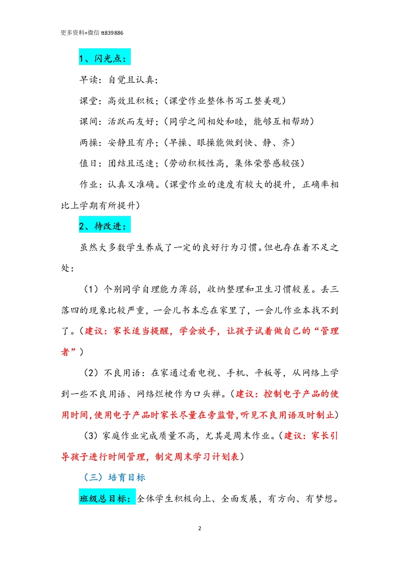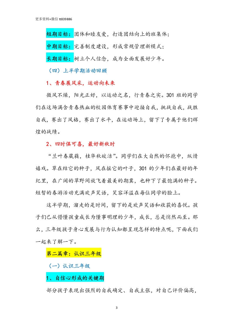 更多资料+微信t839886双向奔赴,为爱而来一一三下期中家长会会前温馨提示:为了保证此次家长会的顺利召开:1.请您将手机调成静音或震动状态2.会议期间不随意走动,若有急事外出,请从后门进出3.请不要在室内空间吸烟4.如有任何疑问,请会后与我私聊,感谢您的配合!正文致家长朋友:最好的教育,是春风化雨的浸润:最美的声音,是家校同频的回响。特别感谢您在百忙之中参加家长会,充分体现出您对孩子教育的重视、对学校工作的大力支持!今天,我们共聚一堂,与孩子一起理性地总结不断成长的“昨天”,陪孩子认真规划充满希望的“今天”,期待见证孩子们真正赢得成功的“明天”!今天的家长会主要从以下几个方面展开:第一篇章:班级成长篇(一)班级介绍我们的班级是一个团结、友爱、齐心、奋进的大团队。目前,班级共有55名学生,女生25人,男生30人。在这一学期里孩子们展现出了积极向上的精神风貌,我们班的孩子,善良懂事、自信独立,自上个学期以来,看着每个孩子逐渐成长,感到非常的开心。(二)班级现状1