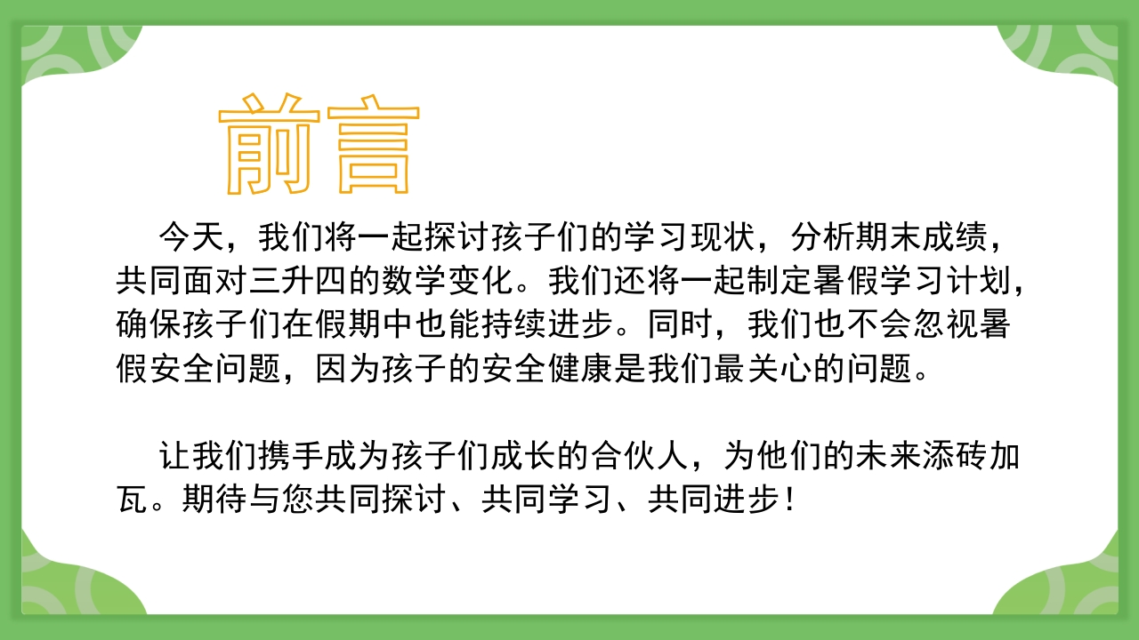 【三下】【数学】【做孩子的成长合伙人】期末家长会(北师大版版)tangqi8812天前发布关注私信13.62MB59页0297 第1页 / 共59页 第2页 / 共59页 第3页 / 共59页 试读已结束,还剩56页,您可下载完整版后进行离线阅读 【三下】【数学】【做孩子的成长合伙人】期末家长会(北师大版版)此内容为付费资源,请付费后查看¥9.9¥19.9VIP会员免费立即购买您当前未登录!建议登陆后购买,可保存购买订单付费资源© 版权声明本站是一个信息分享及获取的平台,不确保部分用户上传资料的来源及知识产权归属,资料由老师投稿,公开渠道整理,网友上传,如果侵犯到您的权益,请联系客服删除THE ENDPPT课件 文本预览 三年级下学期期末家长会做孩子的成长合伙人主讲人:XXX主讲时间:202×.06 查看更多 收起部分 喜欢就支持一下吧点赞7 分享QQ空间微博QQ好友海报分享复制链接收藏