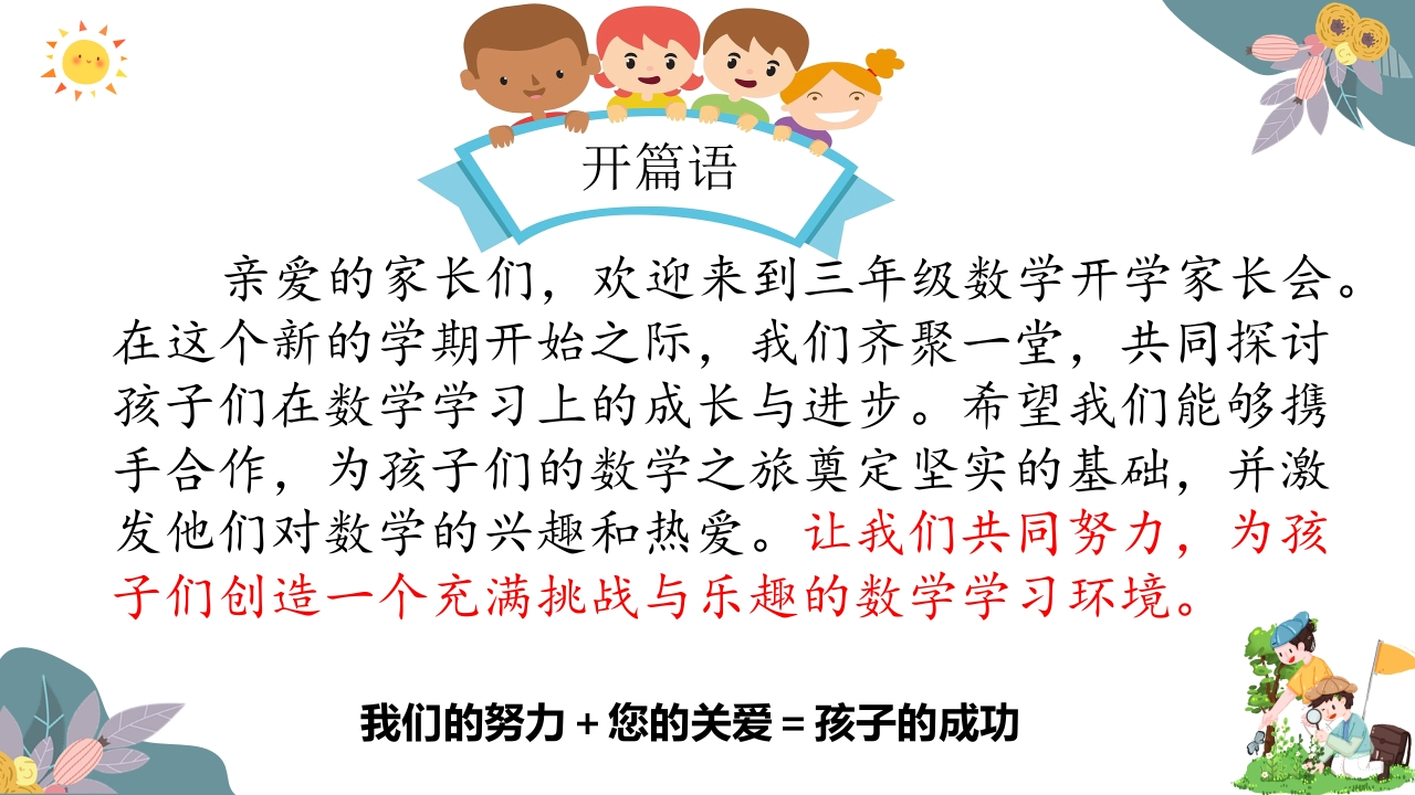 【三下】【家校同心数梦同行】开学家长会发言稿tangqi8812天前发布关注私信8.23MB45页0395 第1页 / 共45页 第2页 / 共45页 第3页 / 共45页 试读已结束,还剩42页,您可下载完整版后进行离线阅读 【三下】【家校同心数梦同行】开学家长会发言稿此内容为付费资源,请付费后查看¥9.9¥19.9VIP会员免费立即购买您当前未登录!建议登陆后购买,可保存购买订单付费资源© 版权声明本站是一个信息分享及获取的平台,不确保部分用户上传资料的来源及知识产权归属,资料由老师投稿,公开渠道整理,网友上传,如果侵犯到您的权益,请联系客服删除THE ENDPPT课件 文本预览 热烈欢迎各位家长的到来家校同心数梦同行同/心/同/行/家/校/协/力/共/育/未/来XXX三(2)班开学家长会 查看更多 收起部分 喜欢就支持一下吧点赞5 分享QQ空间微博QQ好友海报分享复制链接收藏