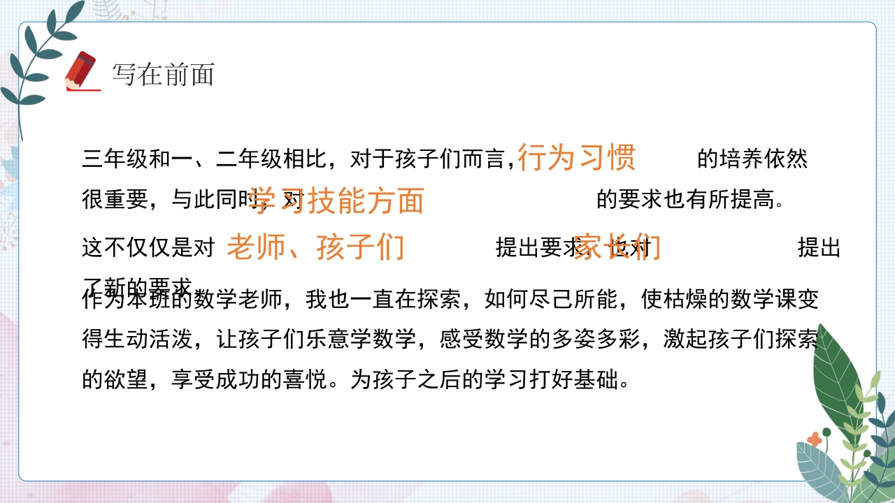 【三下】【数学】【家校齐心跨越三年级】期中家长会tangqi8812天前发布关注私信10.86MB57页0356 第1页 / 共57页 第2页 / 共57页 第3页 / 共57页 试读已结束,还剩54页,您可下载完整版后进行离线阅读 【三下】【数学】【家校齐心跨越三年级】期中家长会此内容为付费资源,请付费后查看¥9.9¥19.9VIP会员免费立即购买您当前未登录!建议登陆后购买,可保存购买订单付费资源© 版权声明本站是一个信息分享及获取的平台,不确保部分用户上传资料的来源及知识产权归属,资料由老师投稿,公开渠道整理,网友上传,如果侵犯到您的权益,请联系客服删除THE ENDPPT课件 文本预览 家校齐心跨越三年级同/心/同/行/家/校/协/力/共/育/未/来分三年级数学期中家长会老师:XXX 查看更多 收起部分 喜欢就支持一下吧点赞6 分享QQ空间微博QQ好友海报分享复制链接收藏