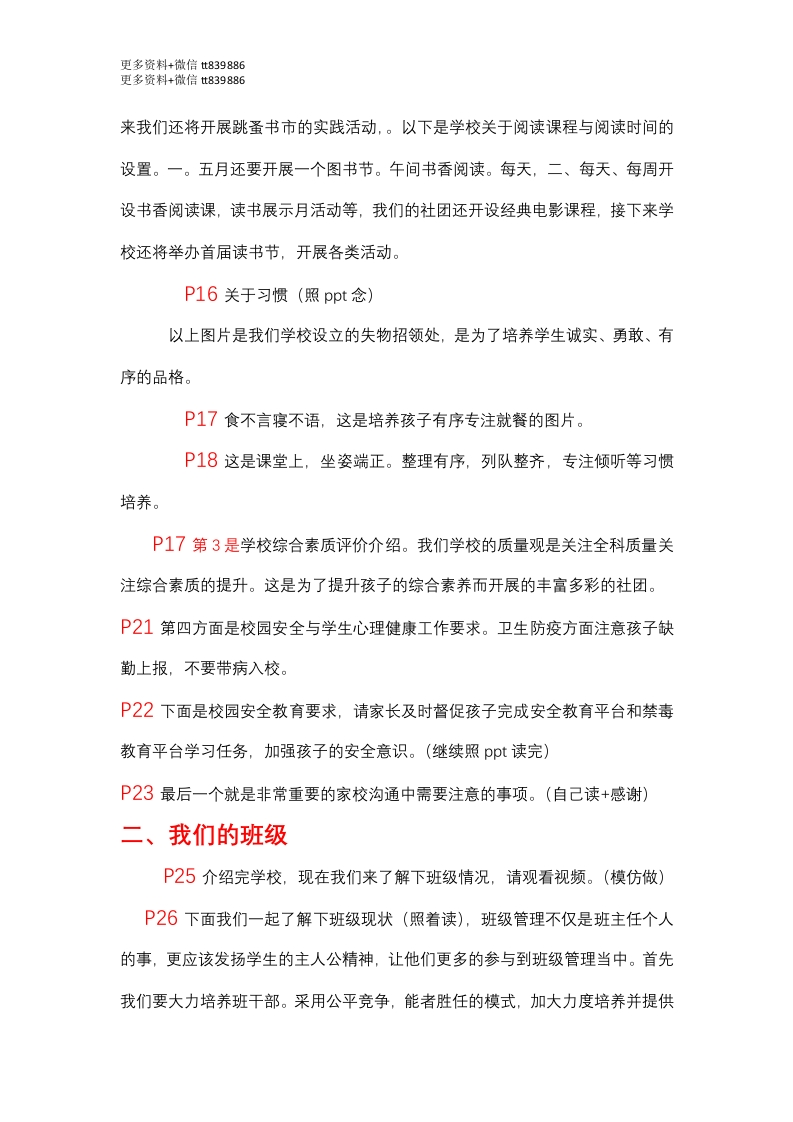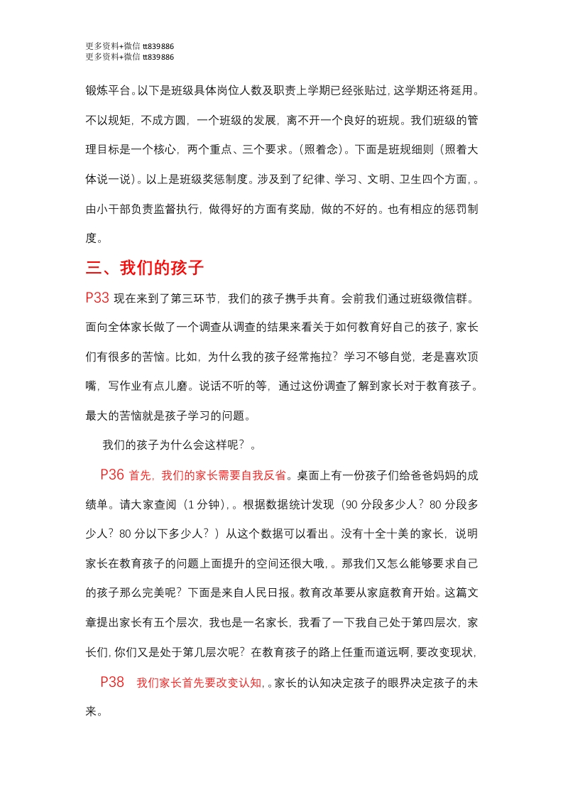 更多资料+微信t839886更多资料+微信t839886三下家长会逐字稿各位家长早上好。很高兴今天我们能坐在这里。一起沟通孩子的教育问题,今天家长会的主题是沟通协作,关注孩子成长,希望通过今天的交流,我们的教育能变得明朗,今天的会议议程分为四个方面,我们的学校,我们的班级,我们的孩子,我们的展望。一、我们的学校P3P5首先来了解一下我们的学校。(照ppt念),。现在体育成绩在各学科的占比中越来越高。那我们先来了解一下各年级测试项目及评分标准。这是六年级的。这是五年级。四年级。重点关注一下三年级的,项目分为肺活量、50米跑、坐位体前屈、一分钟跳绳,仰卧起坐。家长们可以根据这个评分表,自己在家里给孩子做有针对性的练习。我们学校也根据刚才的评分表,然后对这些重点项目在学校进行了针对性的训练。学校的各种体育活动也非常的丰富(翻动PPT,有照片)。相信坚持训练,有一天你的孩子也会登上荣誉的领奖合。P10其次,我们要相信阅读的重要性。这里是统编教材中对于小学阶段孩子的阅读的一些要求。我们家长们可以花一分钟时间观看一下,你的孩子是否在各个阶段都达标。我们的孩子现在是处于第二学段(阅读重要性照着念3页)P14关于阅读,学校和班级又做了什么呢?我们一起来看一看吧,。首先,我们建立了班级图书角。关于书籍的推荐。我们打破了以往只有语文才阅读的局限,适应多学科阅读,比如数学、科学、社会等书籍。推荐书籍由家长自愿购买或者班费购买。班级图书角建立后。采取午间阅读和家庭阅读相结合。未